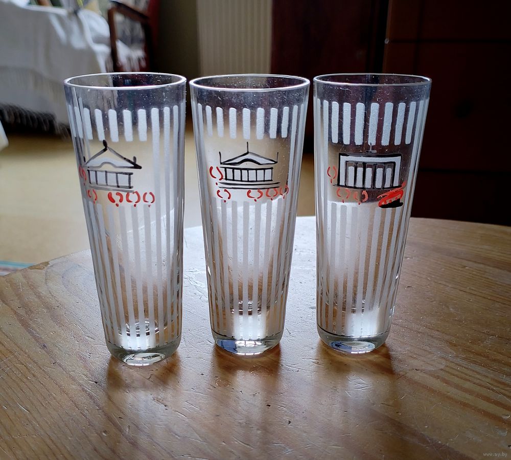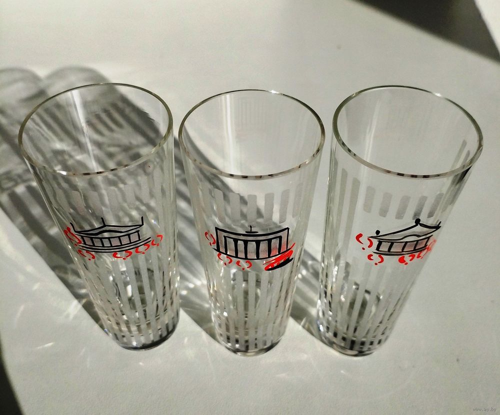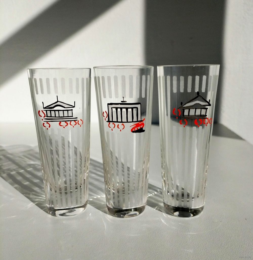 Три рюмочки 50 мл в идеальном состоянии из комплекта с видами Минска «Достопримечательности Минска», 1960-е гг. Цена за одну рюмку.