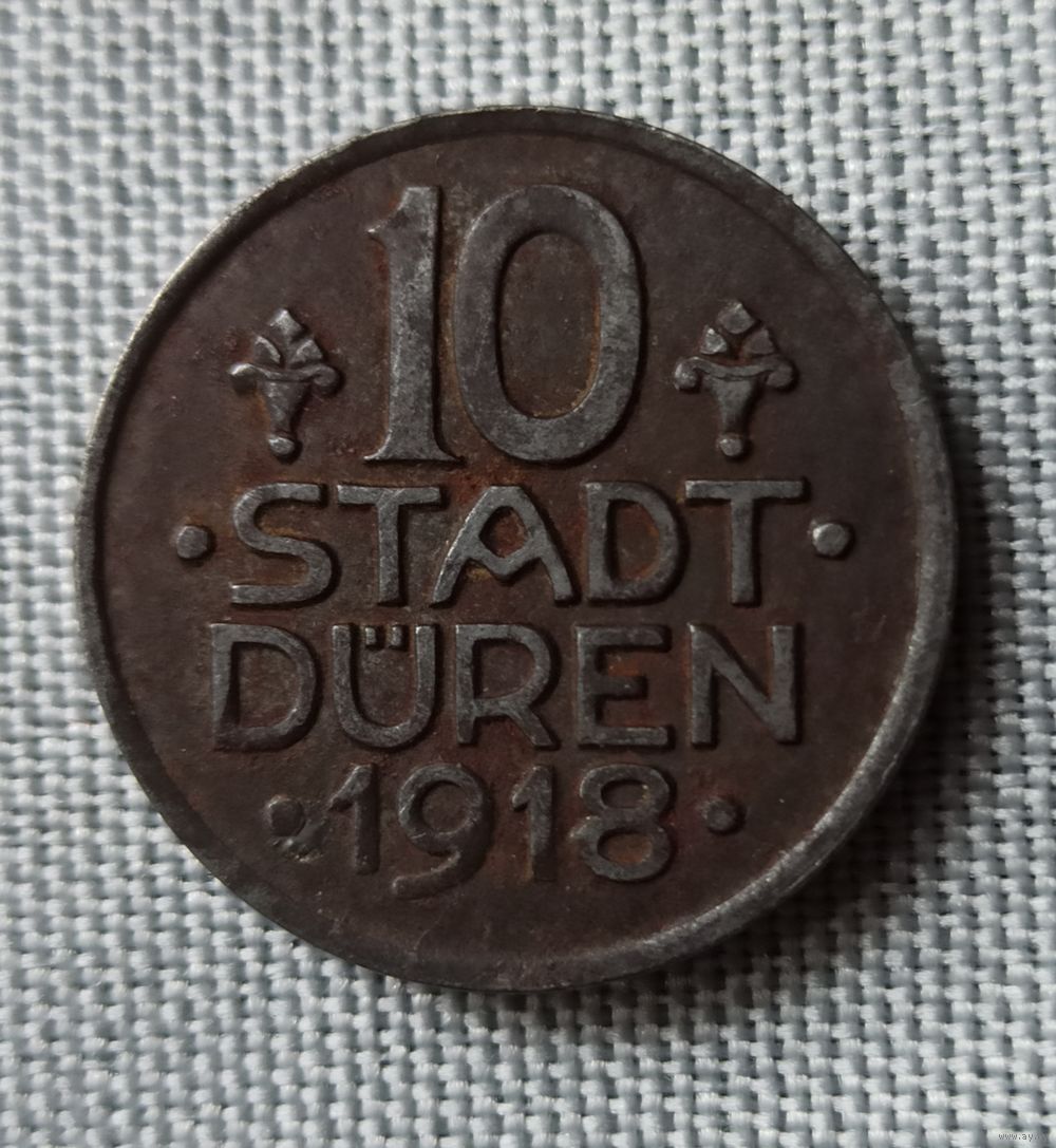 Немецкая экстренная монета (нотгельд) достоинством 10 пфеннигов, номиналом 10 пфеннигов 1918 года из города Дюрен, Германия.