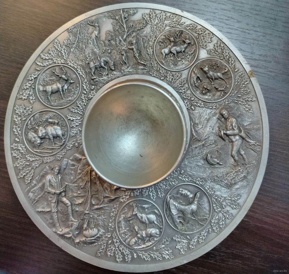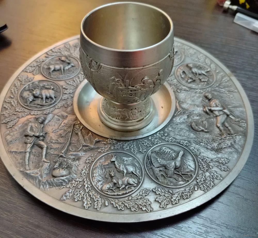 Выполнено из высококачественного олова с содержанием металла не менее 95% Дизайн тарелка и кубок украшены барельефами на охотничью тематику , включая изображение животных ( оленей , птиц ) и охотников .размер кубка высота 9 см диаметр 7 см тарелка диаметр 24см вес с кубком 800 грамм , Подойдет в виде хорошего красивого винтажного подарка или в виде презента .