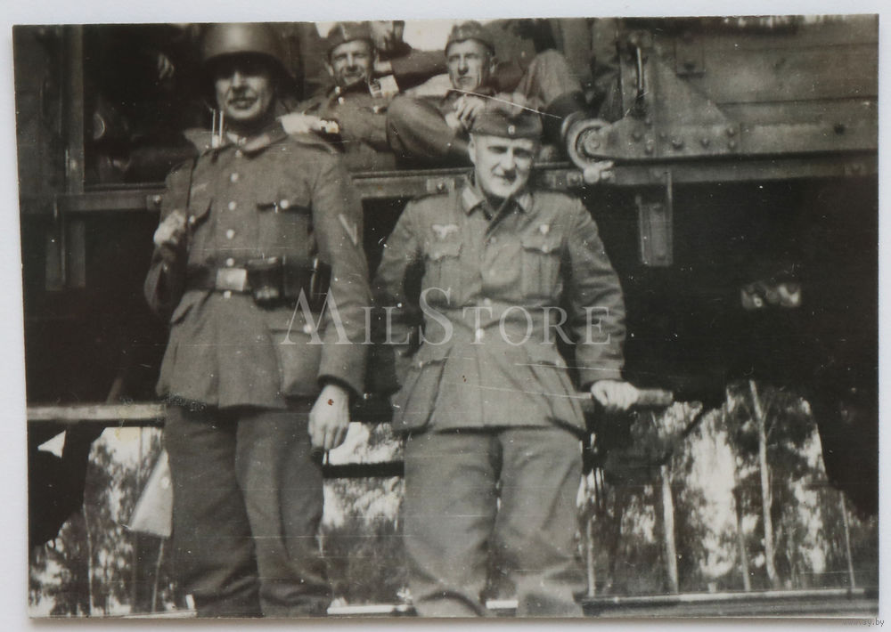 Тыл группы армий "Центр". БССР, РСФСР. Фото одного из подразделений 45-й пехотной дивизии. 45-я пехотная дивизия летом 1941 года штурмовала Брестскую крепость, а позже участвовала в наступлении на Москву, где понесла тяжелые потери. Смотрите другие фотографии этой серии. Размер около 5,4 см. х 7,8 см..