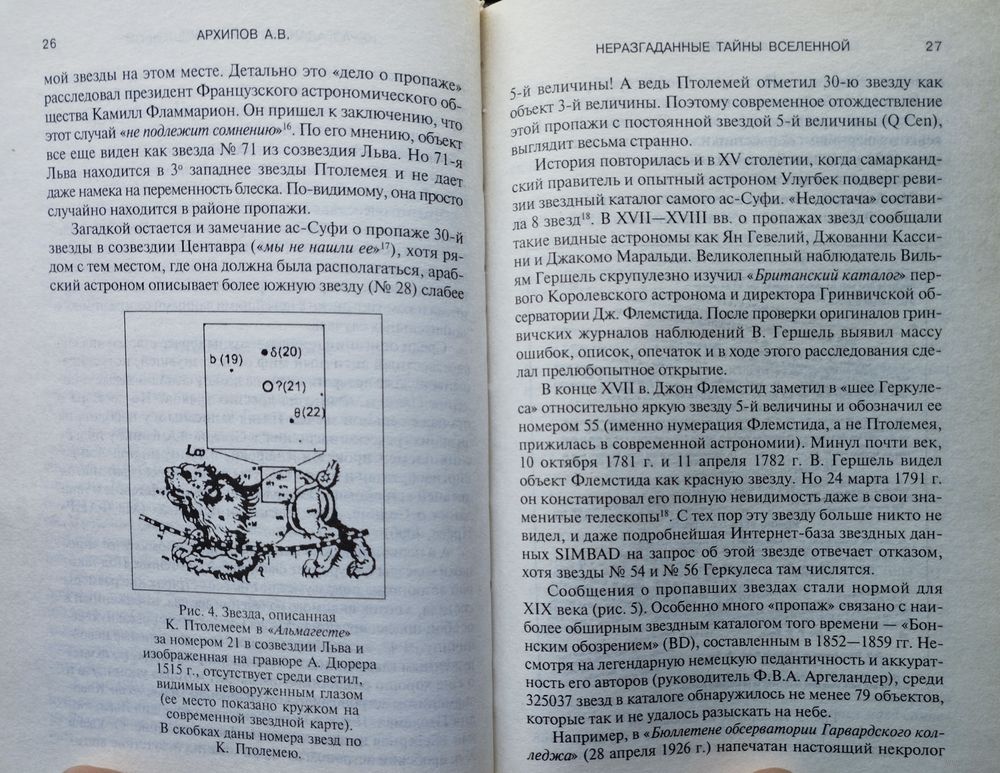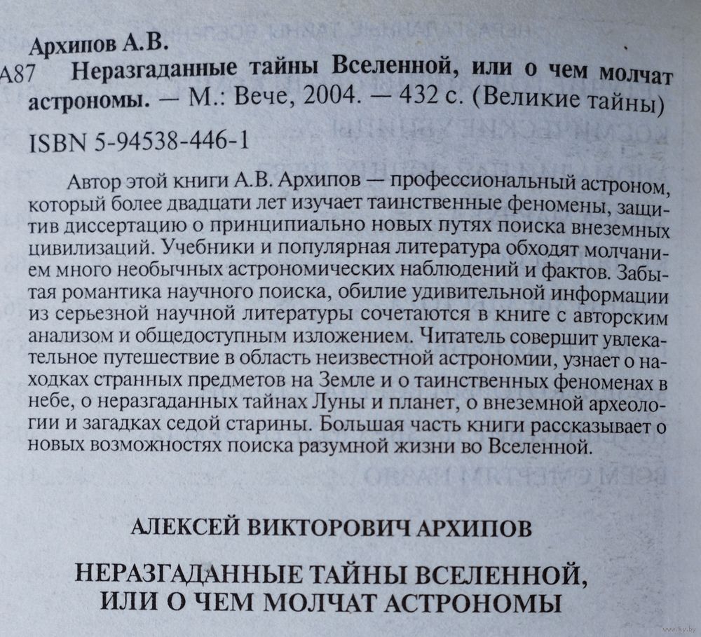 Тираж 5000 экз. 438 стр. Автор этой книги А.В. Архипов — профессиональный астроном, который более двадцати лет изучает таинственные феномены, защитив диссертацию о принципиально новых путях поиска внеземных цивилизаций. Учебники и популярная литература обходят молчанием много необычных астрономических наблюдений и фактов. Забытая романтика научного поиска, обилие удивительной информации из серьезной научной литературы сочетаются в книге с авторским анализом и общедоступным изложением. Читатель совершит увлекательное путешествие в область неизвестной астрономии, узнает о находках странных предметов на Земле и о таинственных феноменах в небе, о неразгаданных тайнах Луны и планет, о внеземной археологии и загадках седой старины. Большая часть книги рассказывает о новых возможностях поиска разумной жизни во Вселенной.