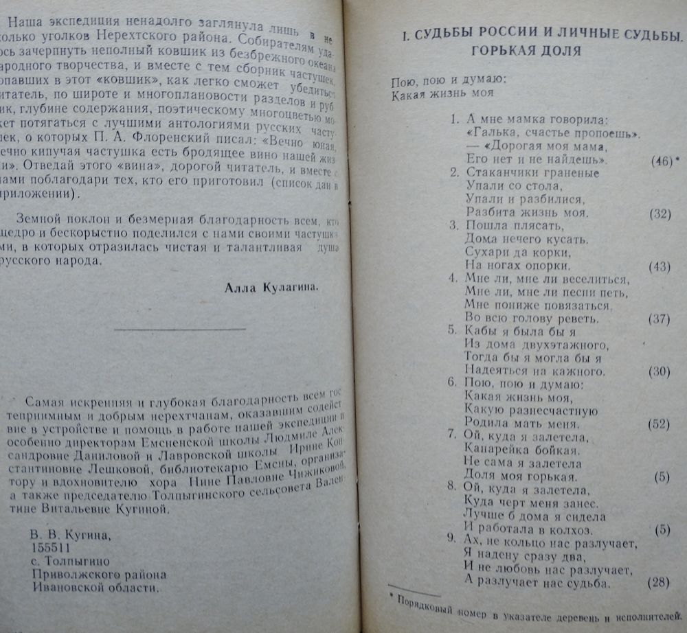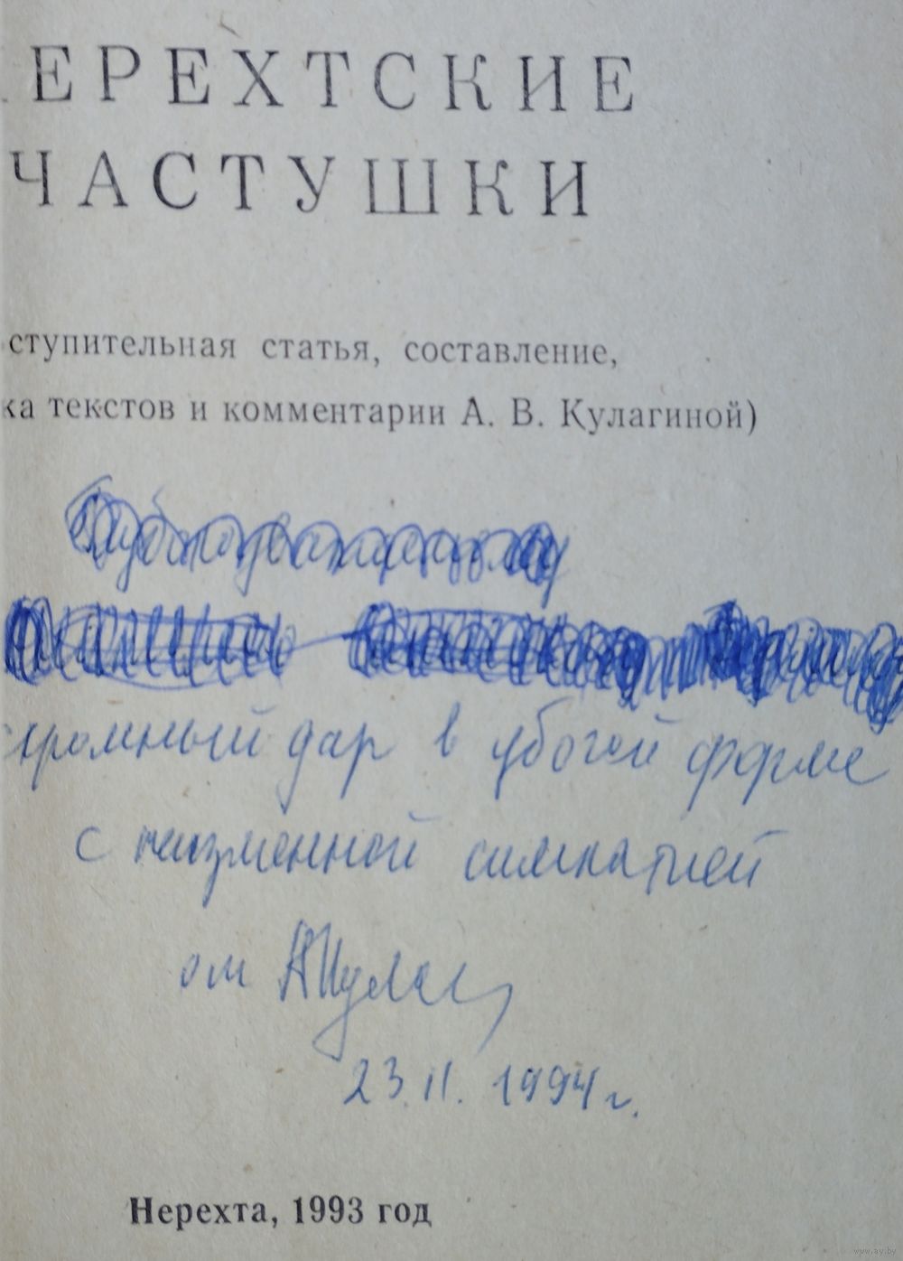 Тираж 800 экз. 200 стр. Автограф автора - Аллы Васильевны Кулагиной, кандидата филологических наук, доцента кафедры русского устного народного творчества филологического факультета МГУ имени М. В. Ломоносова. Алла Васильевна была замечательным фольклористом-полевиком, объездила многие области России, всегда с увлечением и удовольствием работала с народными исполнителями.