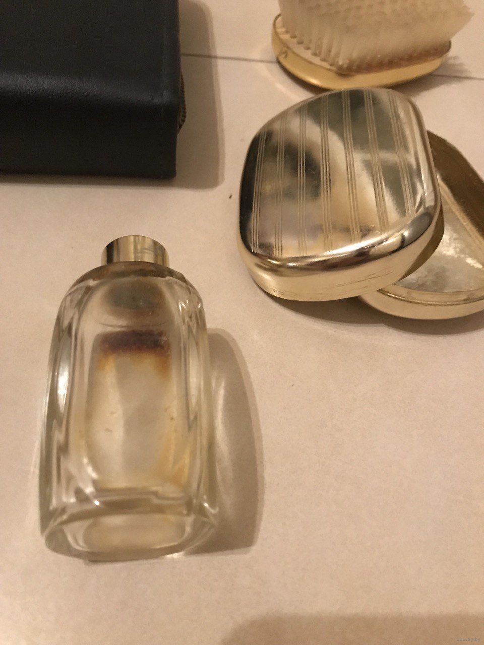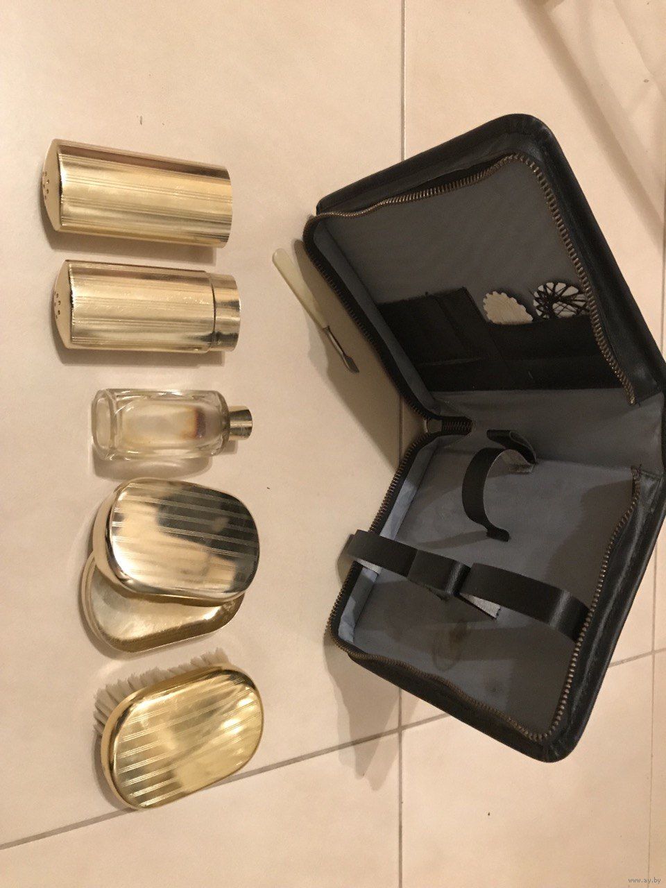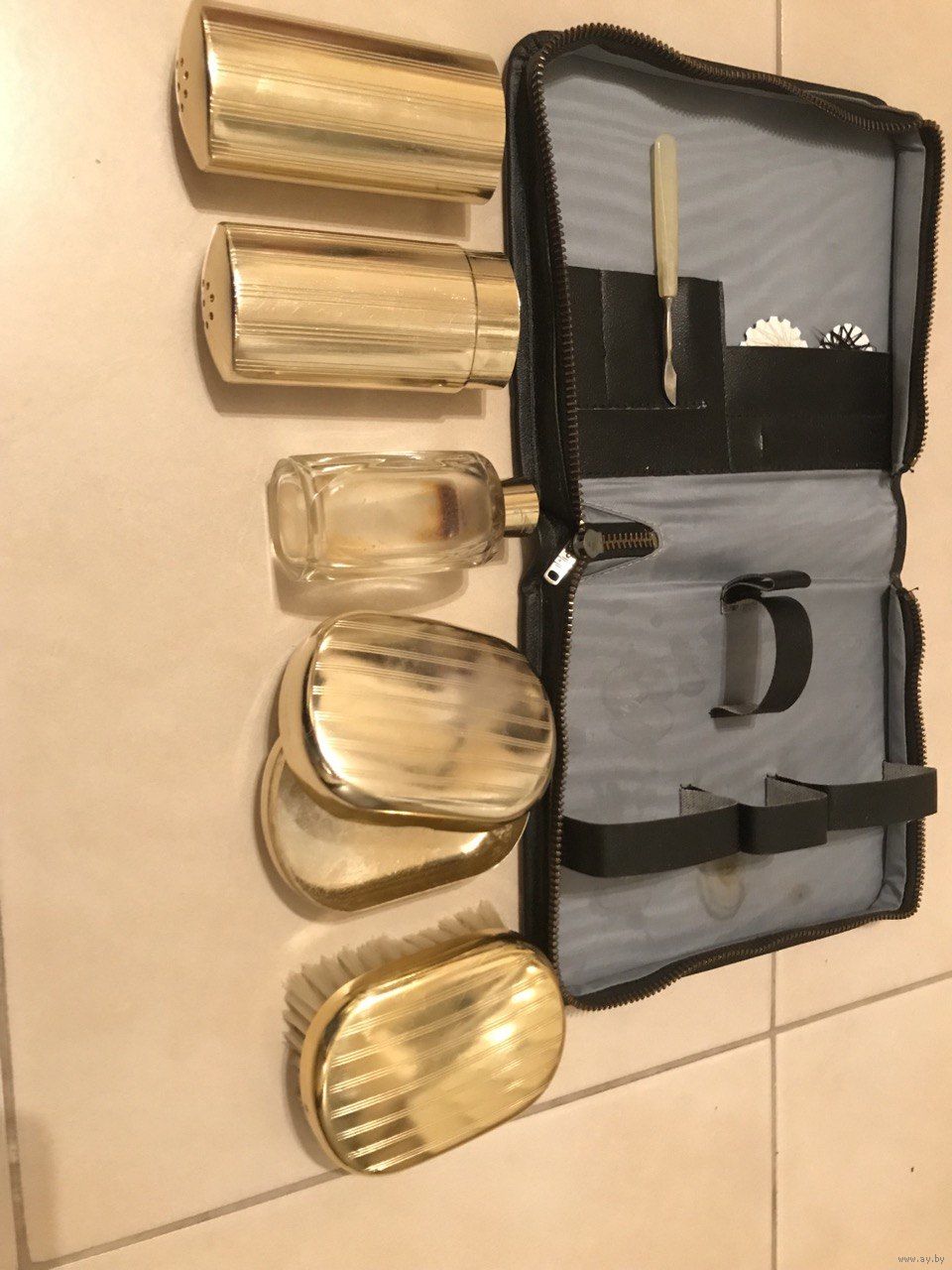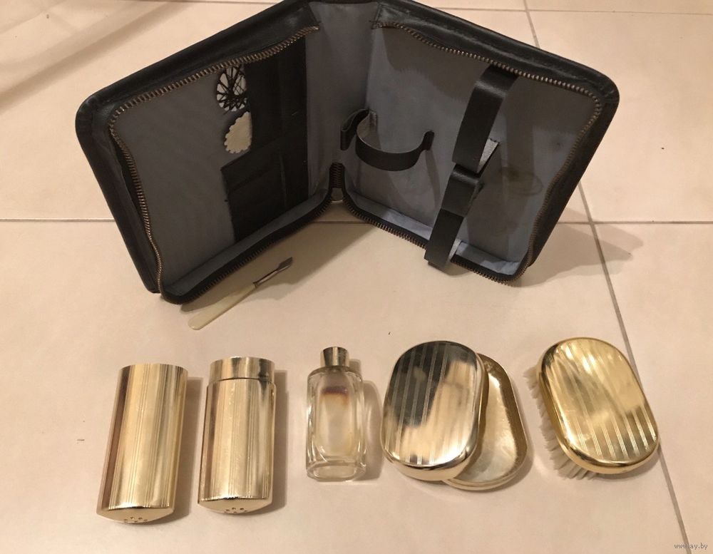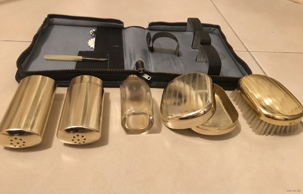 В наборе предмет маникюра, металлические футляры, мыльница, щетка, нитки, оригинальный флакон от одеколона.