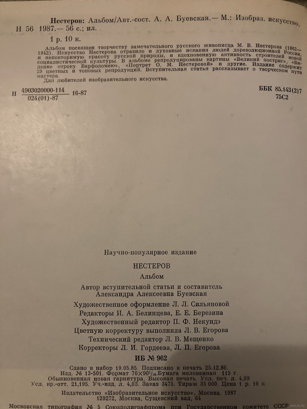 /8/ 56 стр. Альбом посвящен творчеству замечательного русского живописца М.В.Нестерова. Искусство Нестерова отразило и духовные искания людей дореволюционной России, и неповторимую красоту русской природы, и вдохновенную активность строителей новой социалистической культуры. В альбоме репродуцированы картины "Великий постриг", "Видение отроку Варфоломею", "Портрет О.М.Нестеровой" и другие. Издание содержит 29 репродукций.