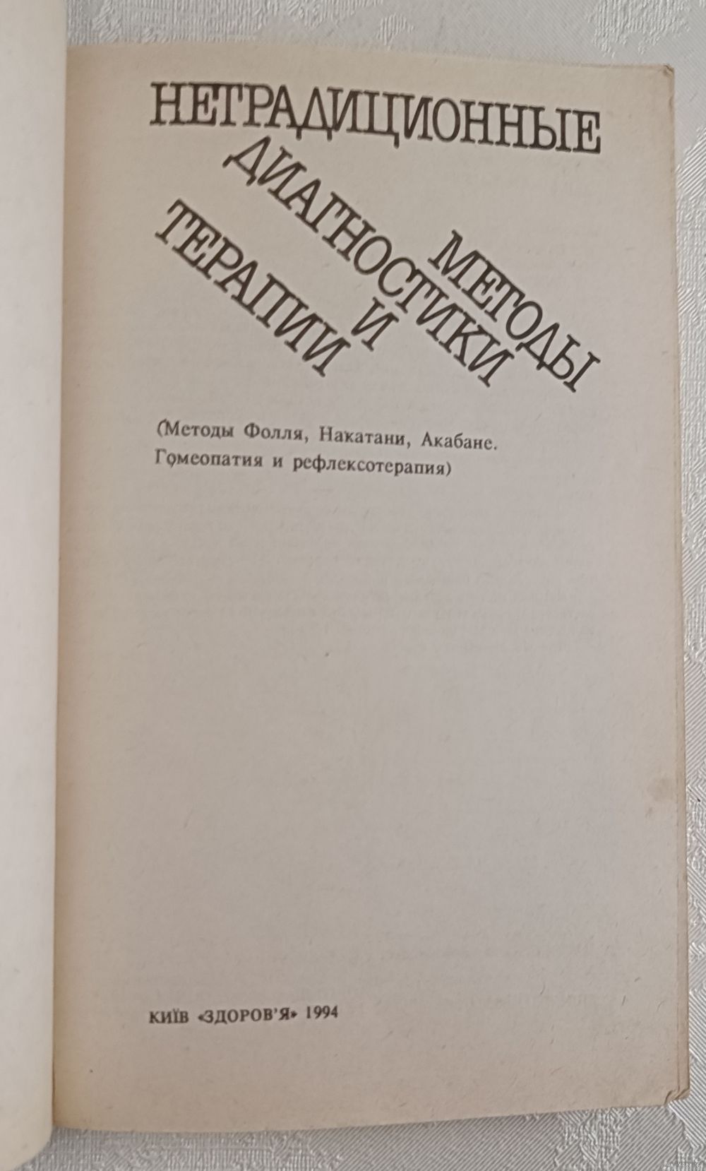 Нетрадиционные методы диагностики и терапии (методы Фолля, Накатани, Акабане, Гомеопатия и рефлексотерапия). Авторы И. З. Самосюк, В.П. Лысенюк, Повжитков А. Н., Бойчук Р. Р., Ю.П. Лиманский, В. Я. Антонченко. Киев, Здоровье, 1994, стр. 240, мягкая обложка, обычный формат.