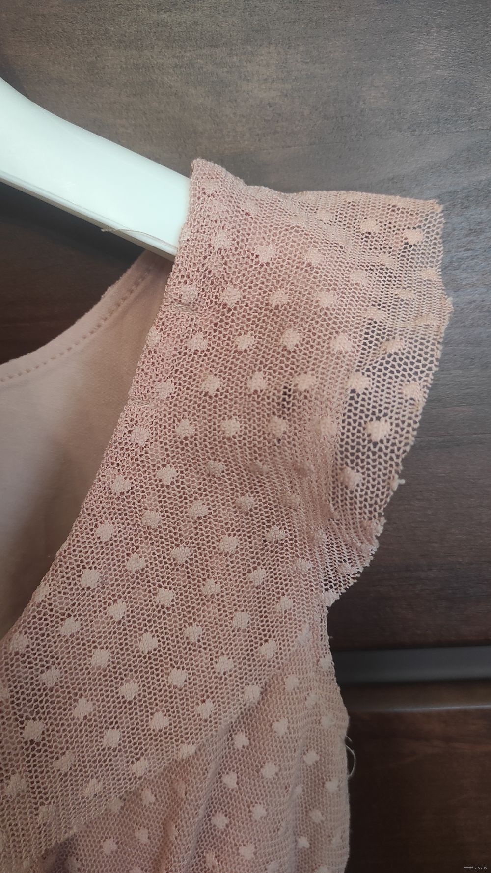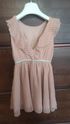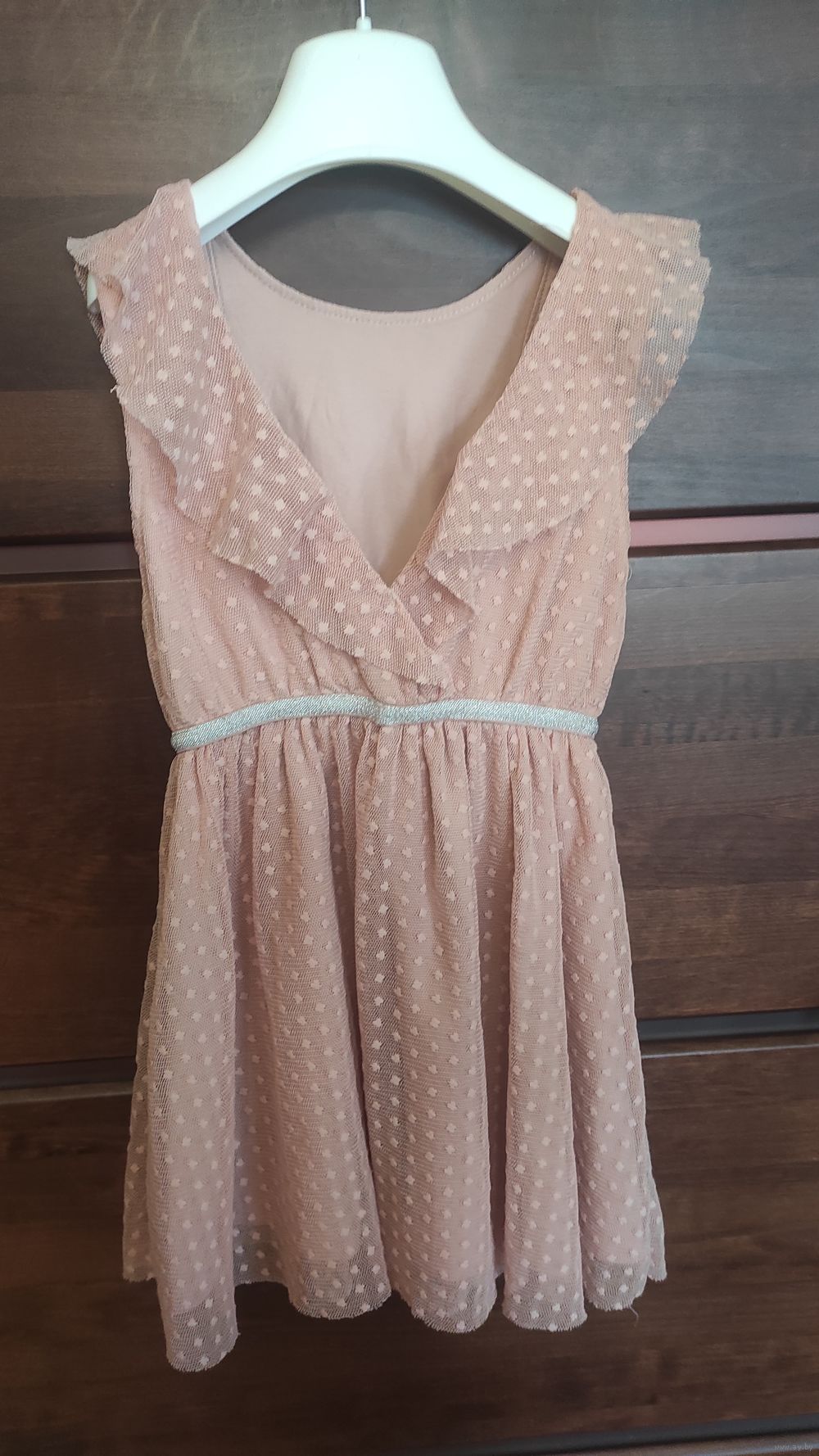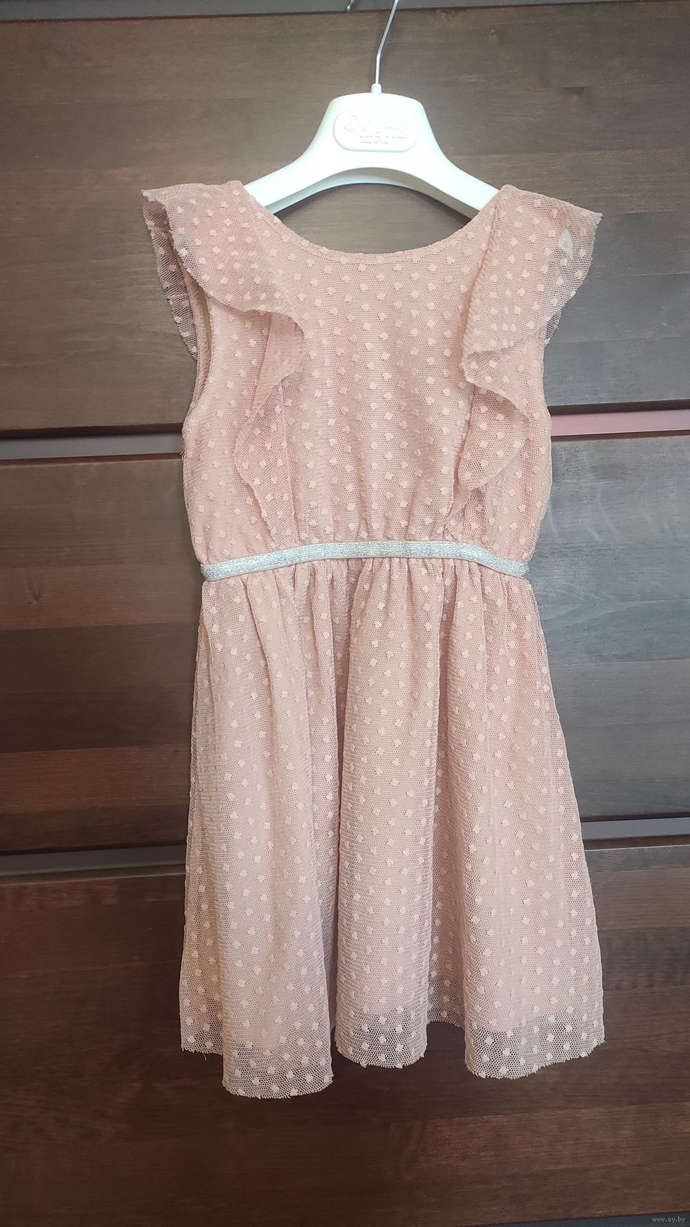 Нежное платье Kiabi на рост 98-107 см. на рост 116 см тоже отлично садится. Очень красивое, нарядное, садится на фигуре идеально. Невероятно мягкое кружево, есть небольшое пятнышко на плече, но прикрывается воланом и практически незаметно. Длина 58 см, ПОталии 24-30 см. Отличное платье.