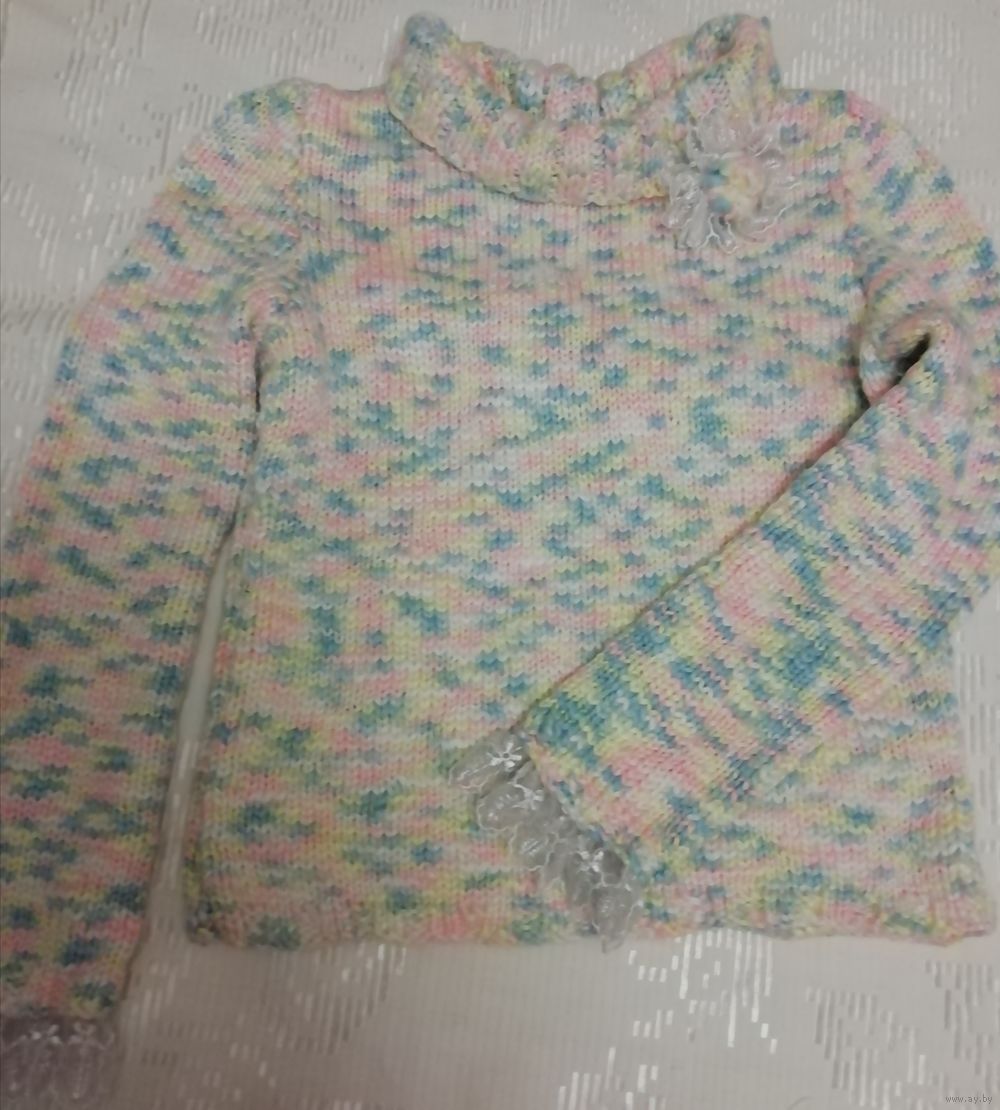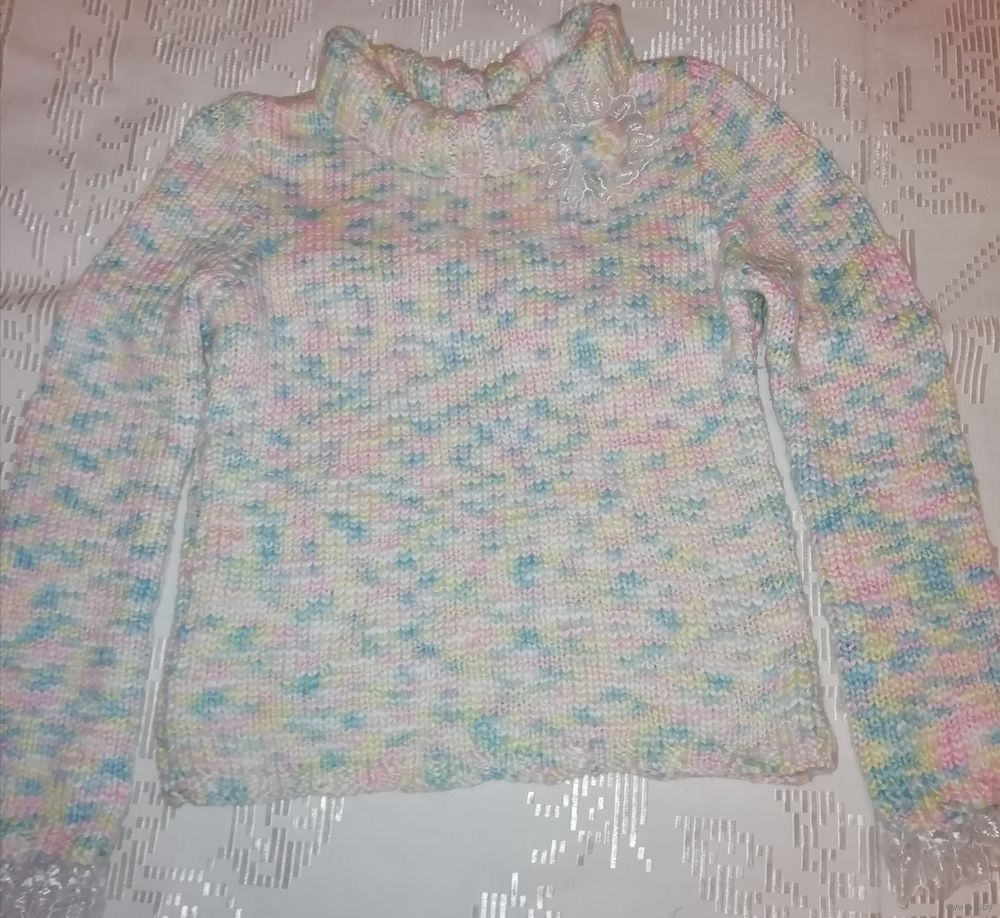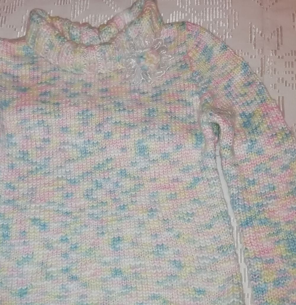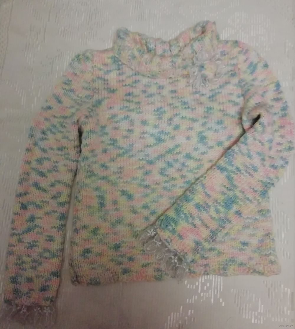 | Свитер ручной вязки, нежной расцветки, теплый, мягкий. Вязка плотная, нить толстая. Размер на наш примерно 44.Состава нити нет, куплены давно,но свитер тёплый, приятныйк телу, не скатывается. | |
