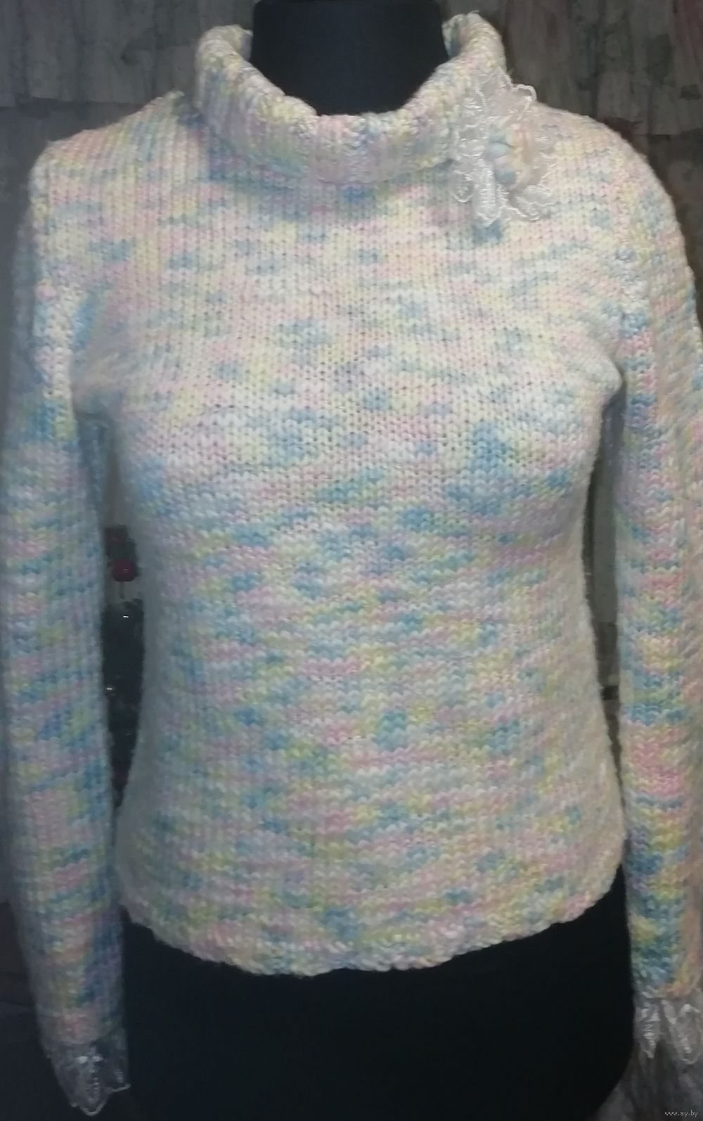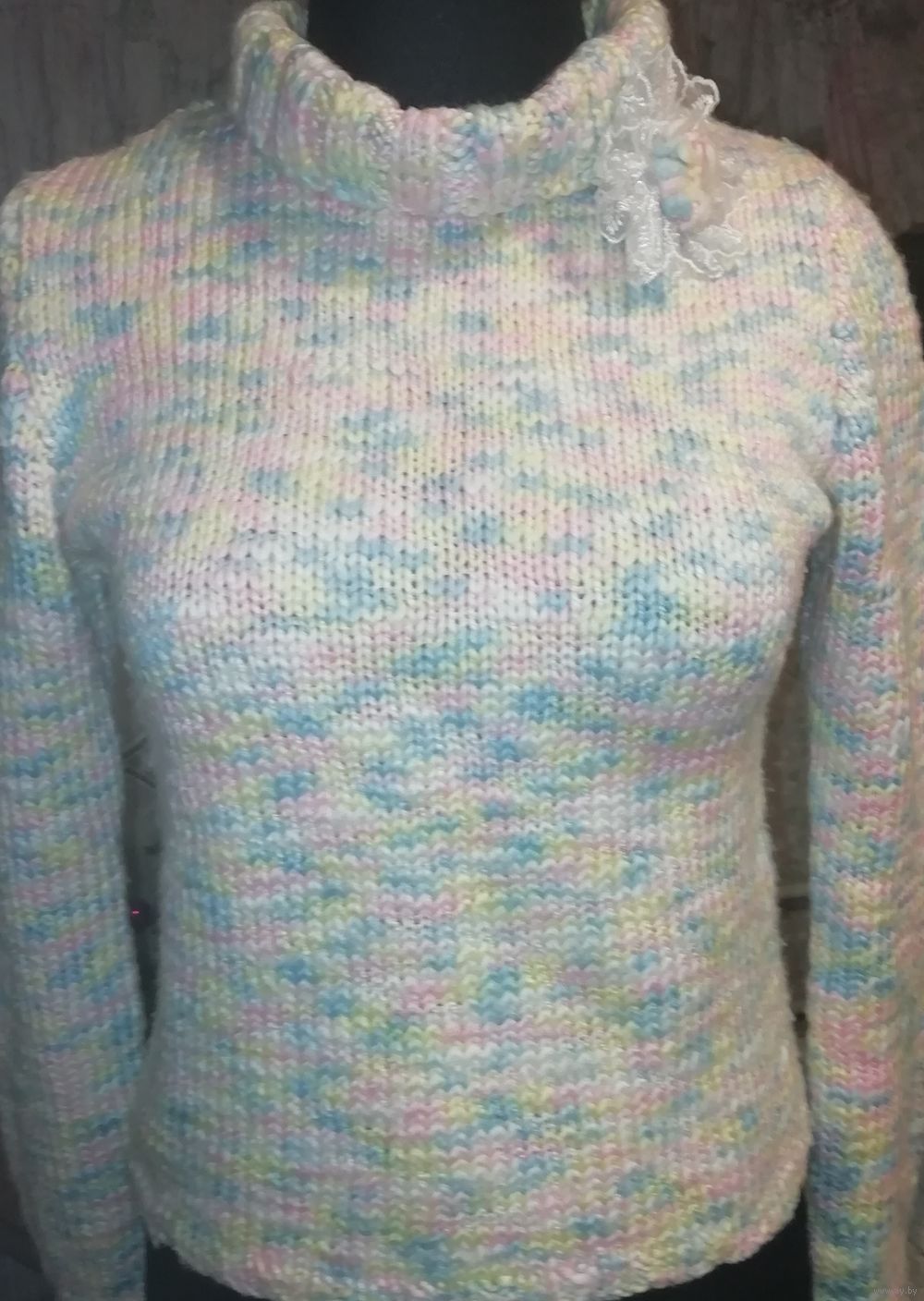 | Свитер ручной вязки, нежной расцветки, теплый, мягкий. Вязка плотная, нить толстая. Размер на наш примерно 44.Состава нити нет, куплены давно,но свитер тёплый, приятныйк телу, не скатывается. | |