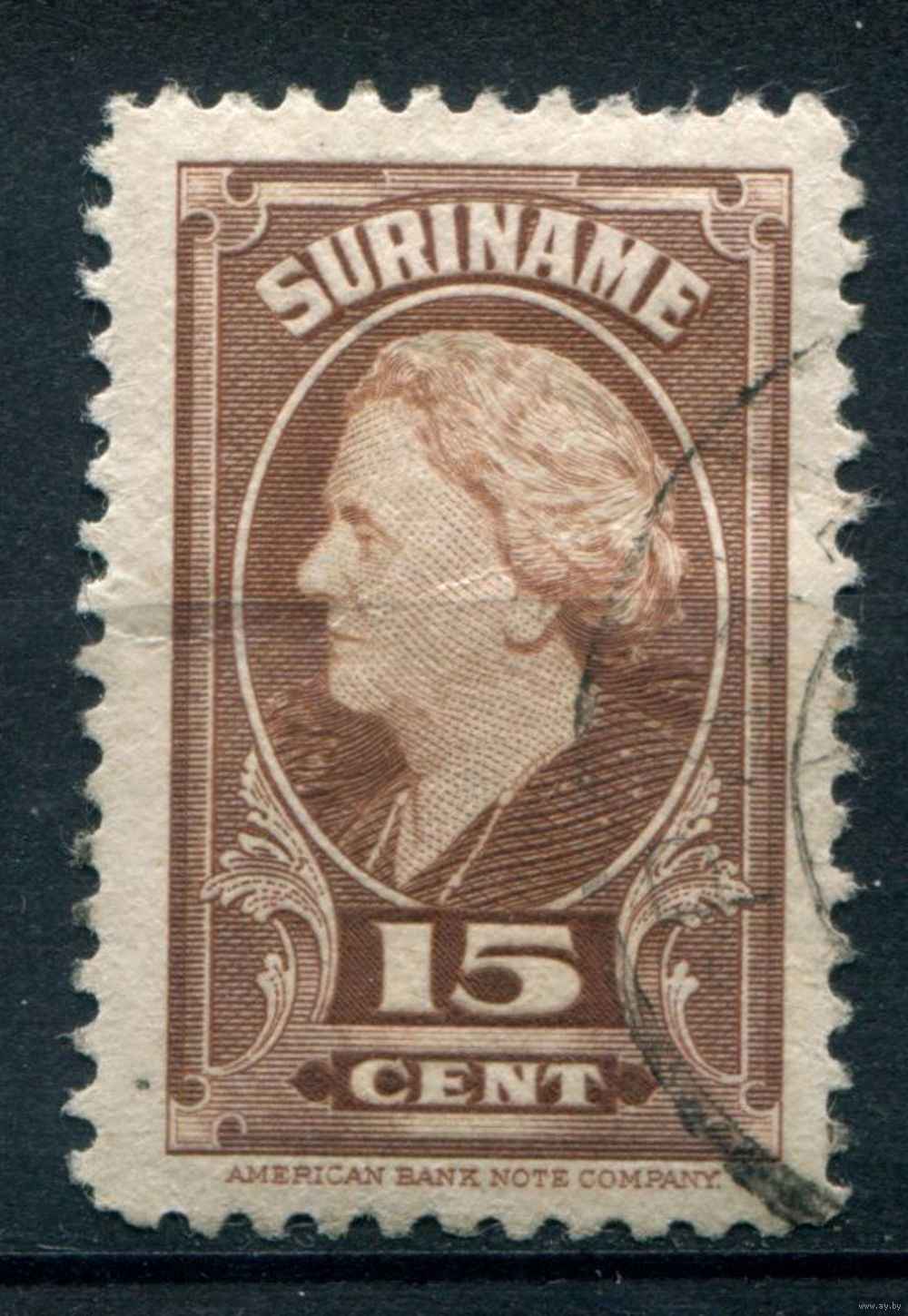 Нидерландские колонии - Суринам - 1945г. - королева Вильгельмина, 15 с - 1 марка - гашёная [Mi 251]. #3-WB-95-A-1