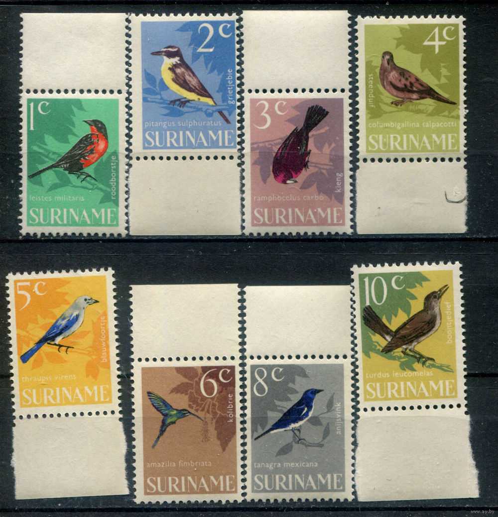 Нидерландские колонии - Суринам - 1966г. - птицы - 8 марок - полная серия, MNH, 2 марки с незначительным дефектом клея, 1 с жёлтым пятнышком на клее [Mi 484-491]. #3-WB-91-KS-2
