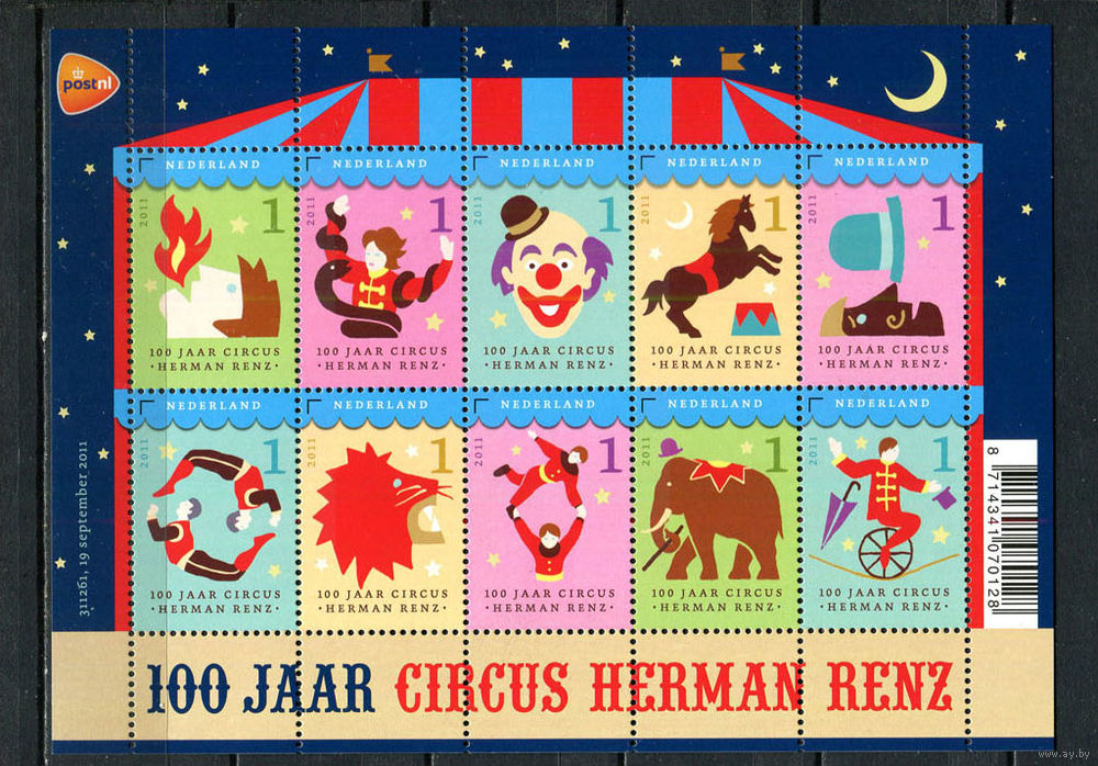 Нидерланды - 2011 - Цирк - [Mi.2905-2914kb] - 1 малый лист. MNH. (Лот 57JA)-TG3P45