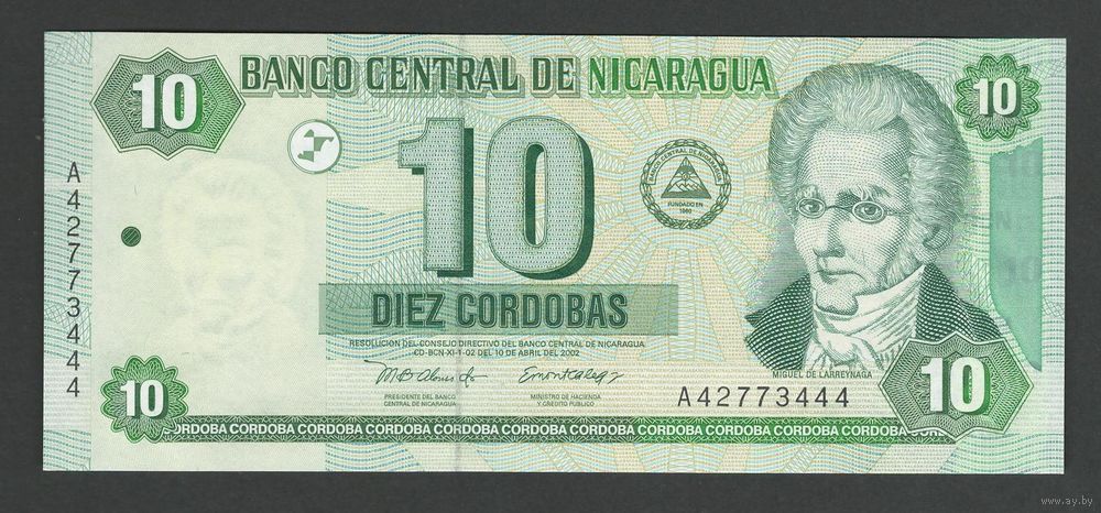 Никарагуа 10 кордоба 2002 года. Тип P-191. Состояние UNC