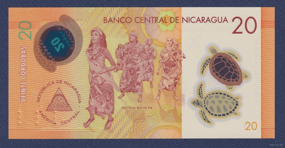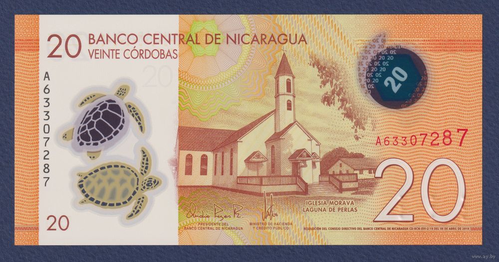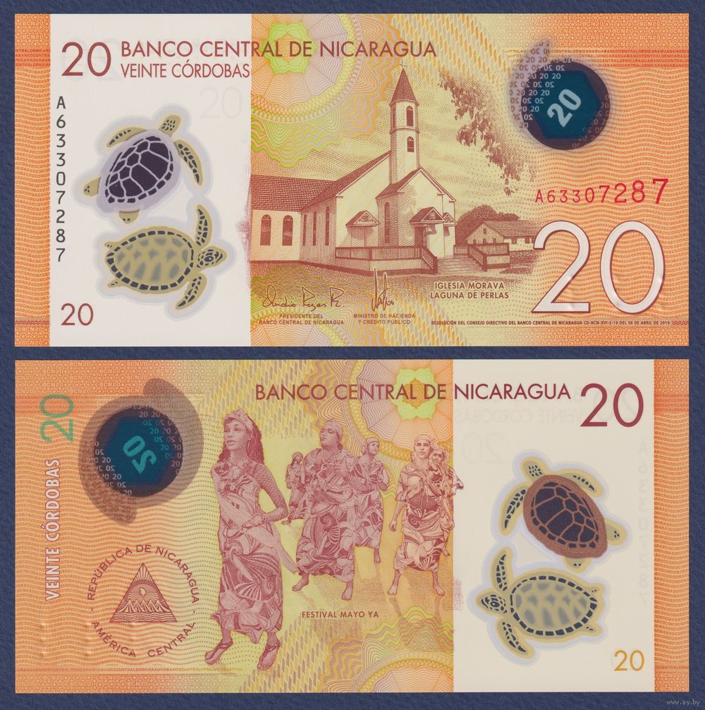 Никарагуа, 20 кордоба 2019 г, P-210 (A, полимер, полимер, моравская церковь в Лагуна-де-Перлас, фестиваль Майо Я), UNC