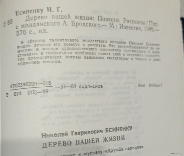 Николае Есиненку. Дерево нашей жизни. Повести, рассказы. М Известия 1989. 576 стр. Библиотека "Дружбы народов". Передача в Витебске возле ратуши. Пересылка в другой город за счёт покупателя по тарифам Белпочты либо Европочты после 100% предоплаты.