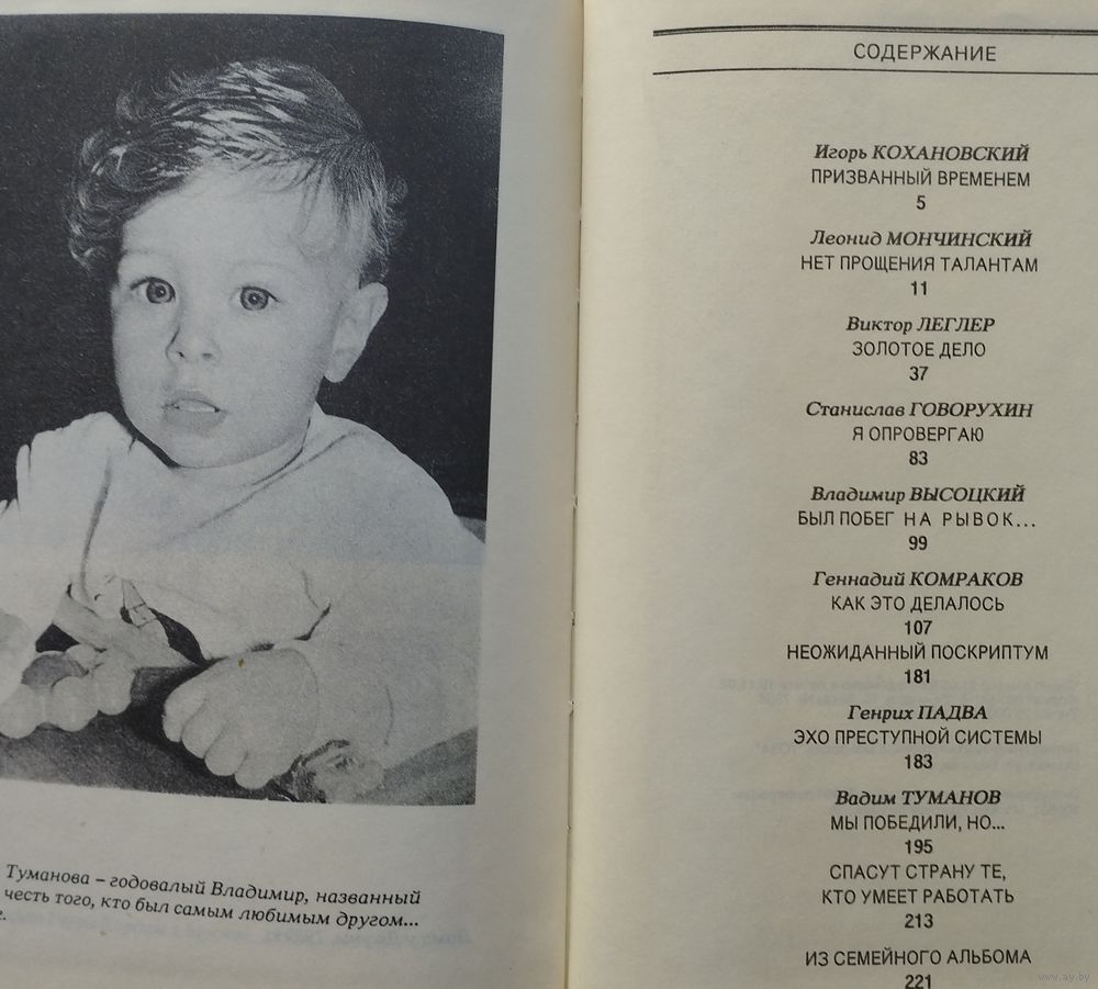 Большой формат. Тираж 25000 экз. 242 стр. Сборник статей и новелл об известном российском предпринимателе Вадиме Туманове. За 35 лет деятельности, часть которых пришлась на застой, а часть — на перестройку, он смог стать, по словам одного из авторов книги, «крестным отцом старательских артелей». Среди авторов Станислав Говорухин, Генрих Падва, Владимир Высоцкий.