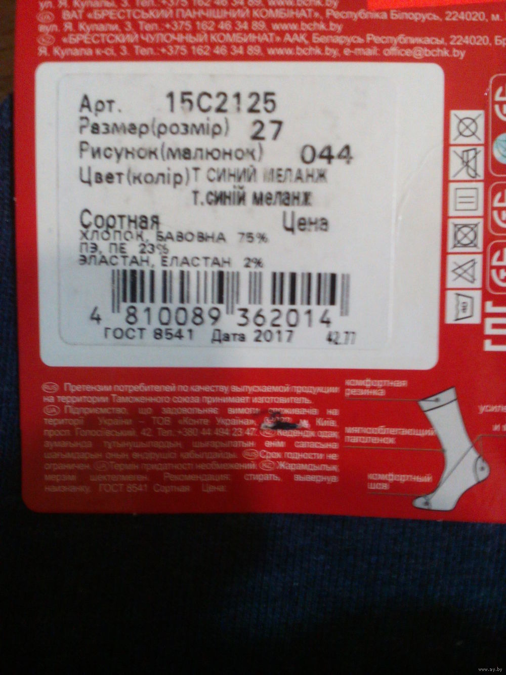РАЗМЕР 27. ХЛОПОК - 75%. ПЭ - 23%. ЭЛАСТАН - 2%.