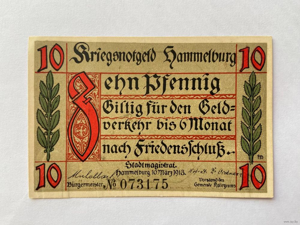 Нотгельд 10 пфеннигов Хаммельбург. Веймарская республика - 1602