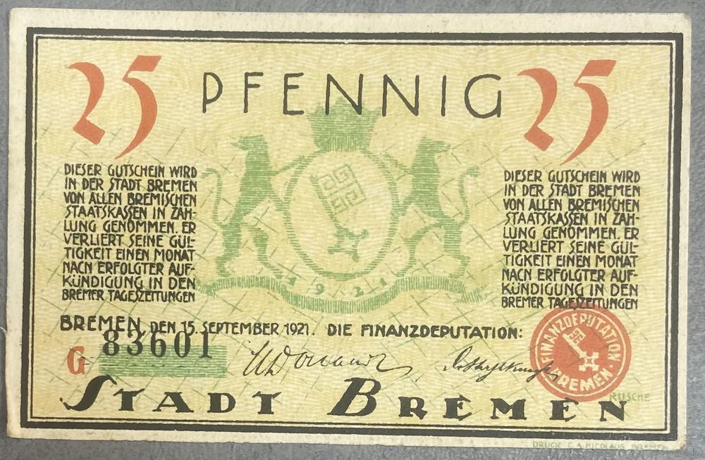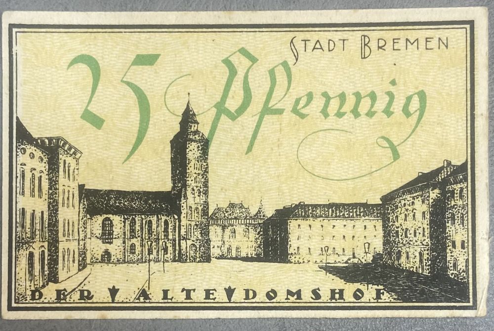 Нотгельд 25 пфеннигов 1921 год. Бремен. Веймарская республика