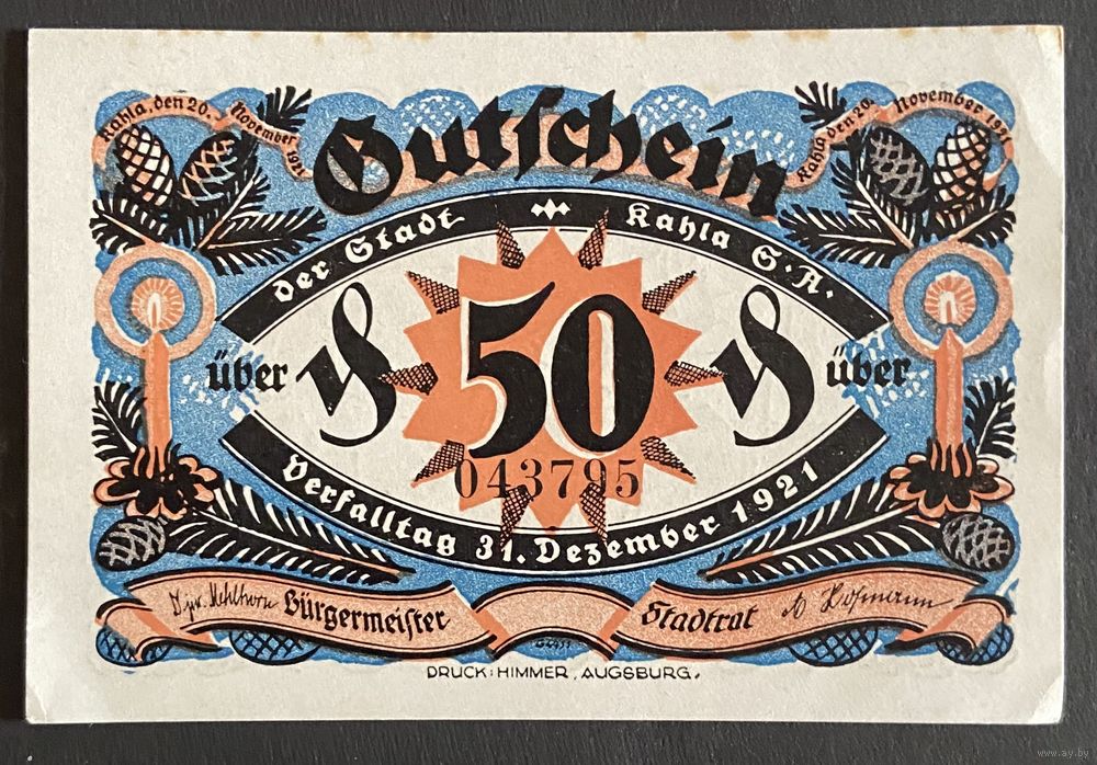 Нотгельд 50 пфеннигов 1921 год. Кала. Веймарская республика