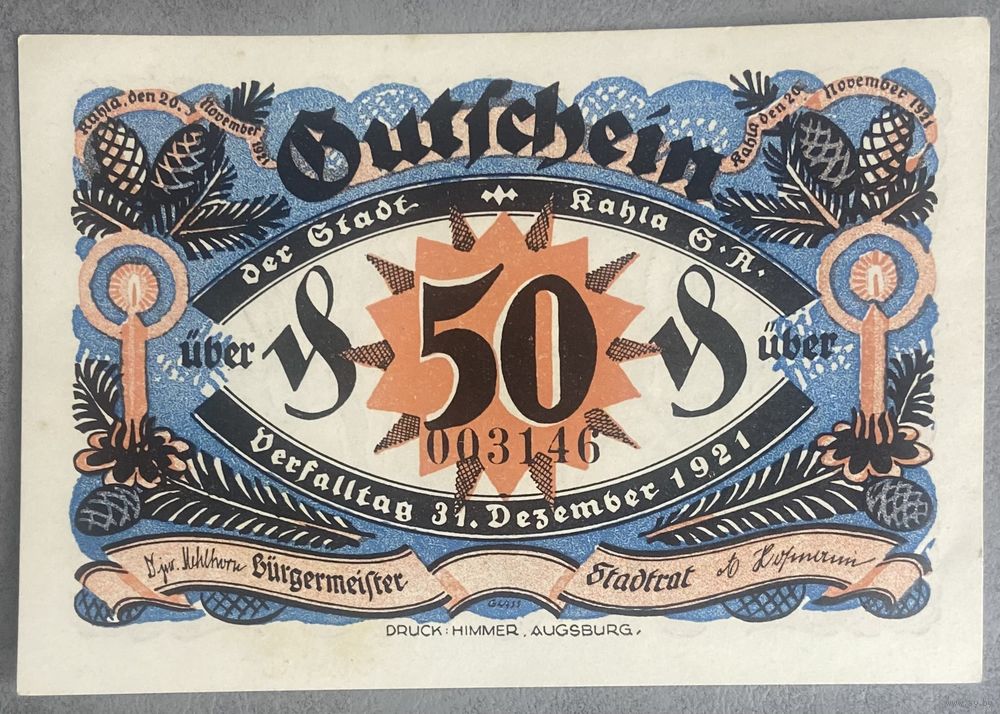 Нотгельд 50 пфеннигов 1921 год. Кала. Веймарская республика