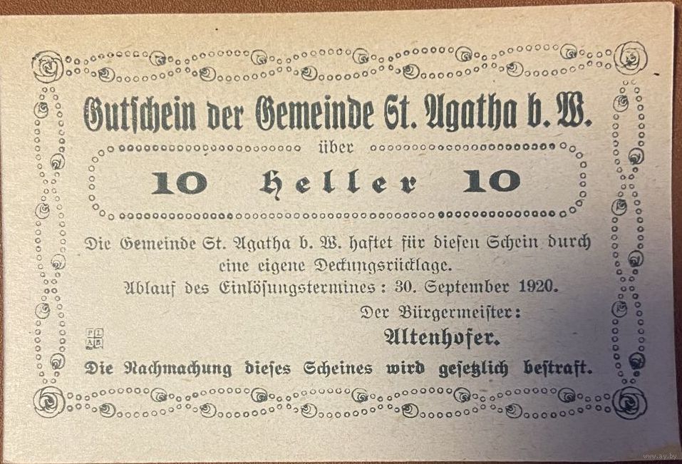 Нотгельд Австрия,10 геллеров 1920