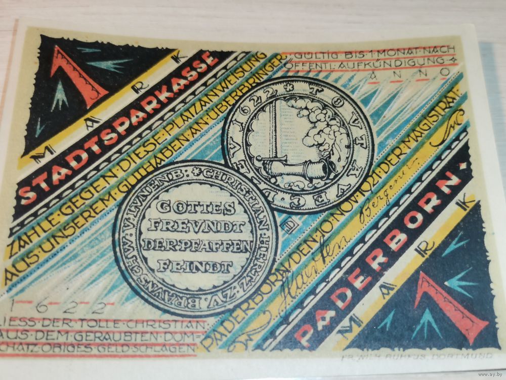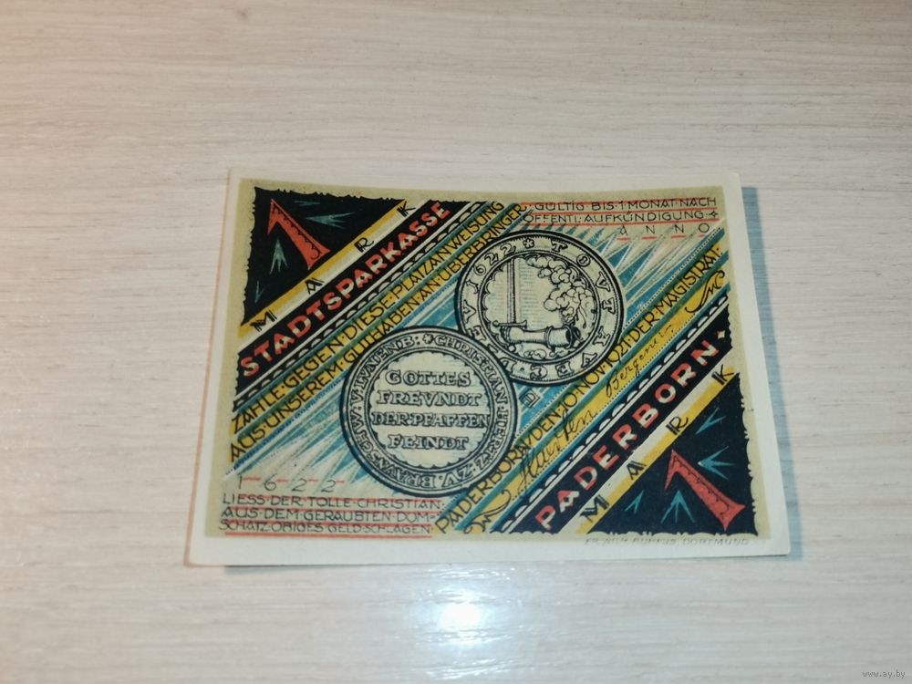 Нотгельд номиналом 1 марка , 1922 года, город Падерборн, Германия.