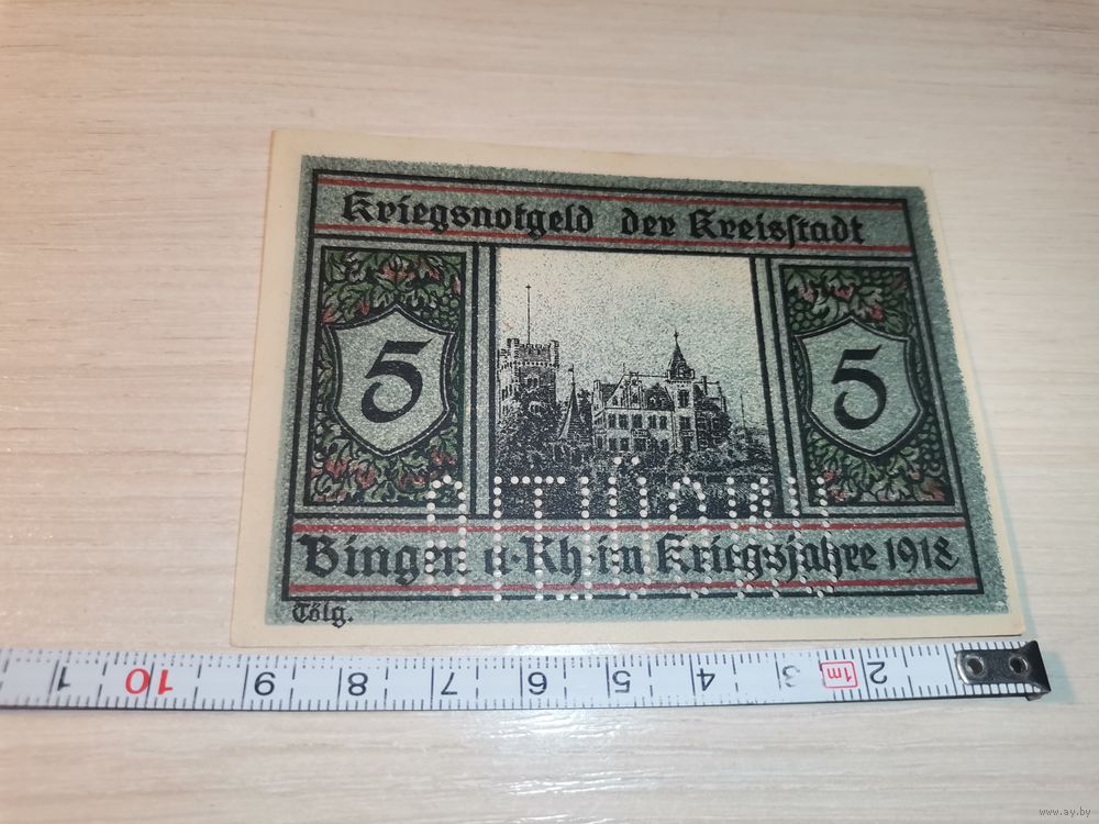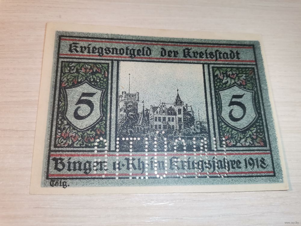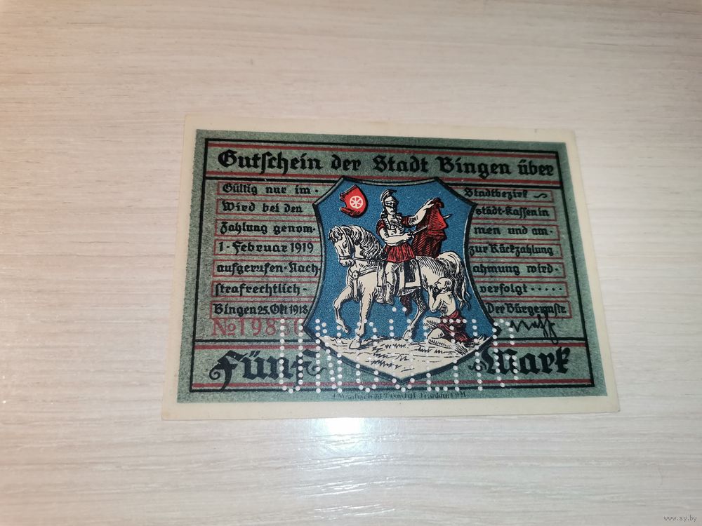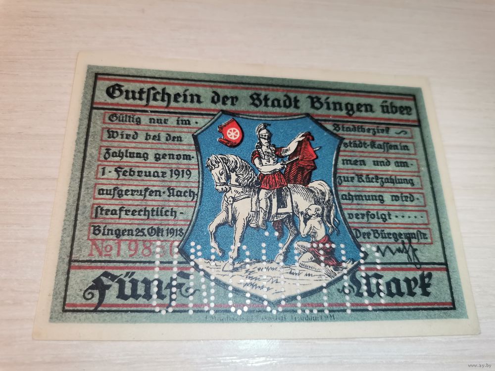 Нотгельд номиналом 5 марок , 1918 года, город Бинген на Рейне, Германия.