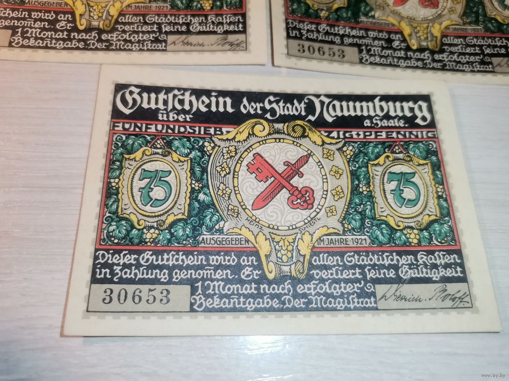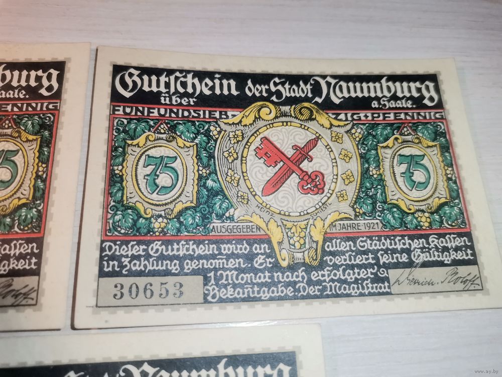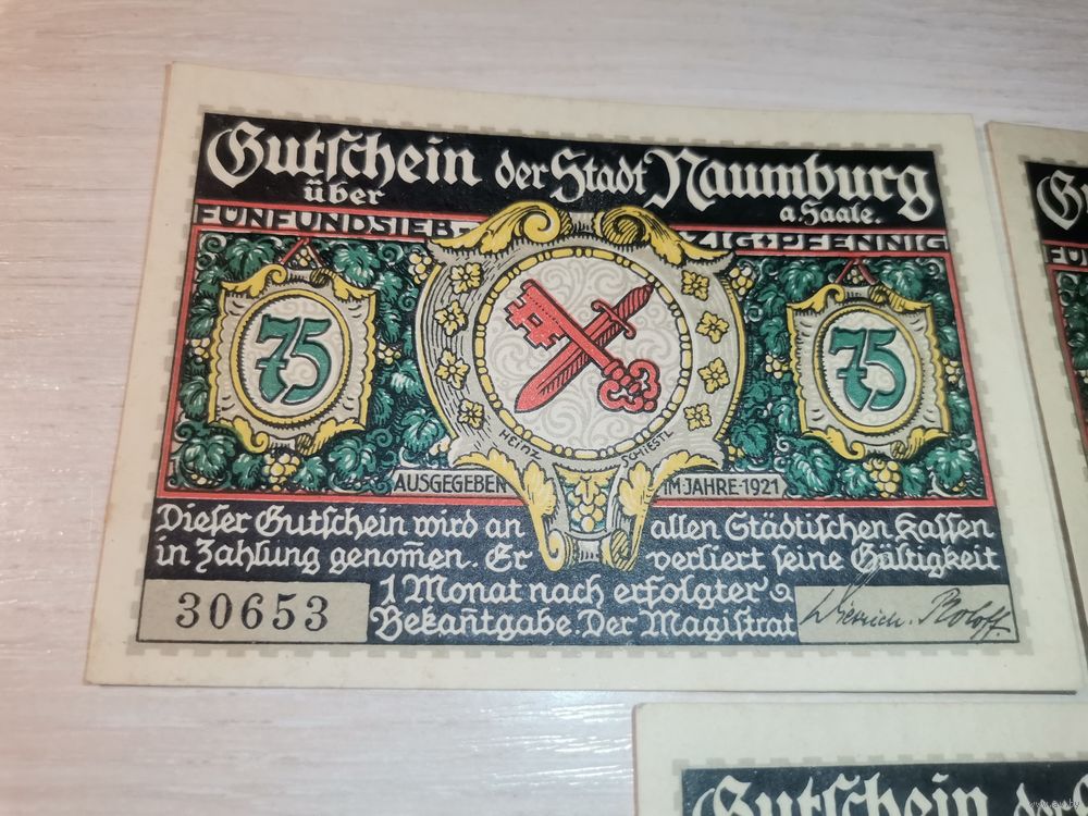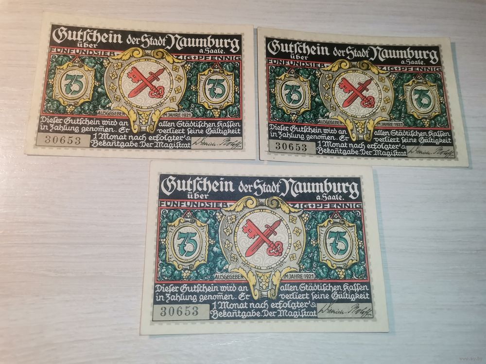 Нотгельды номиналом 75 пфениннгов , 1921 года, город Наумбург, Германия.