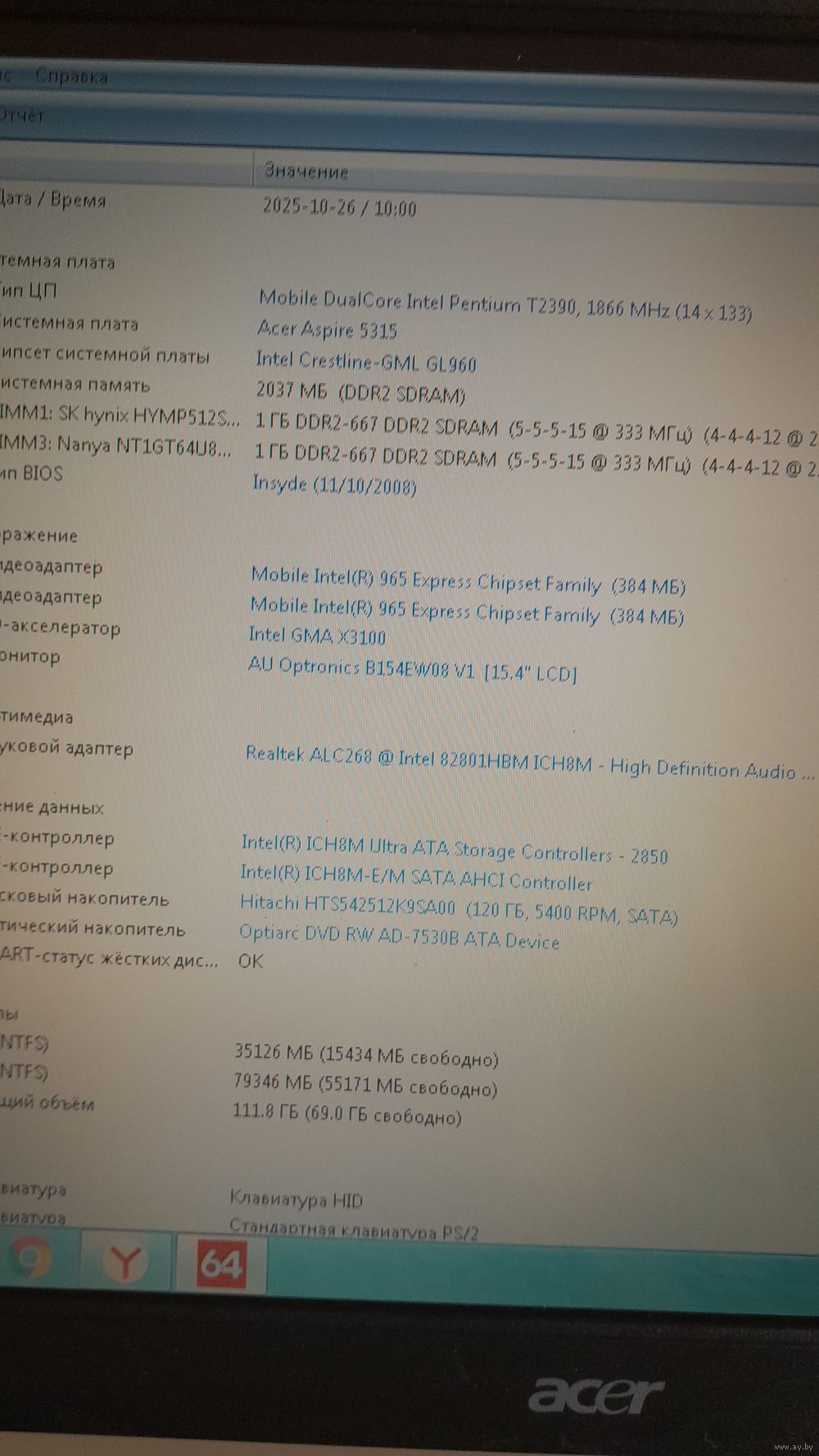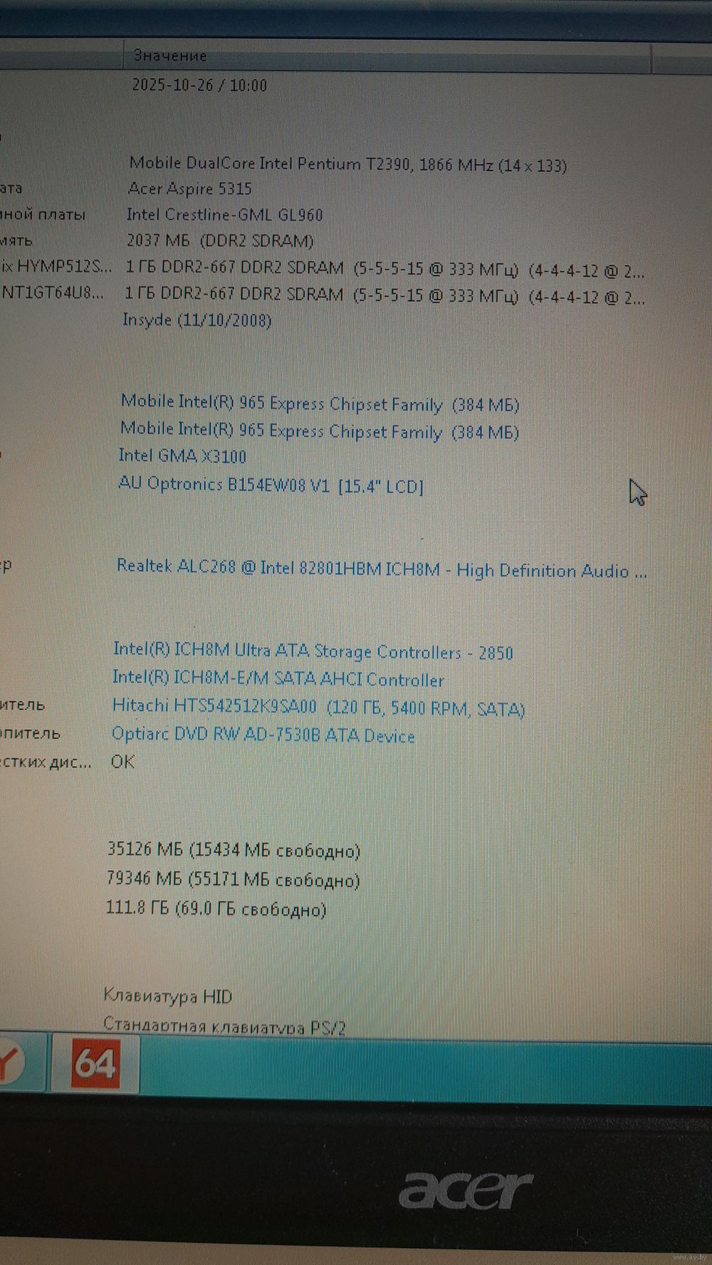 | Видеокарта | 384 Мб, Intel GMA X3100 |