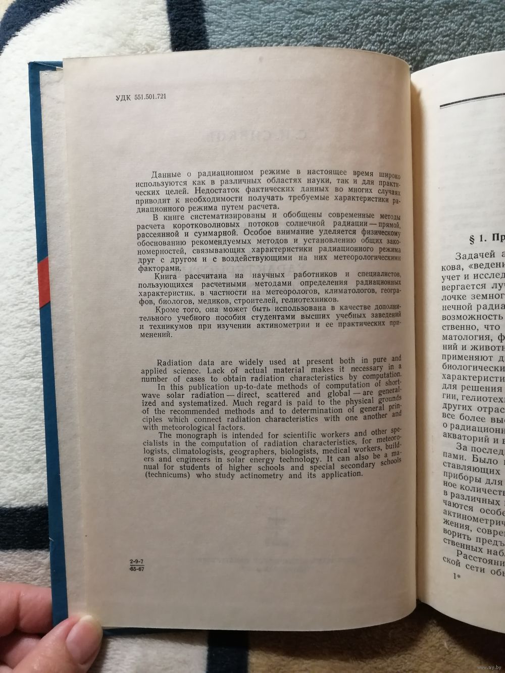 Данные о радиационном режиме в настоящее время широко используются как в различных областях науки, так и для практических целей. Недостаток фактических данных во многих случаях приводит к необходимости получать требуемые характеристики радиационного режима путем расчета. В книге систематизированы и обобщены современные методы расчета коротковолновых потоков солнечной радиации—прямой, рассеянной и суммарной. Особое внимание уделяется физическому обоснованию рекомендуемых методов и установлению общих закономерностей, связывающих характеристики радиационного режима друг с другом и с воздействующими на них метеорологическими факторами. Книга рассчитана на научных работников и специалистов, пользующихся расчетными методами определения радиационных характеристик, в частности на метеорологов, климатологов, географов, биологов, медиков, строителей, гелиотехников. Кроме того, она может быть использована в качестве дополнительного учебного пособия студентами высших учебных заведений и техникумов при изучении актинометрии и ее практических применений.Оглавление.