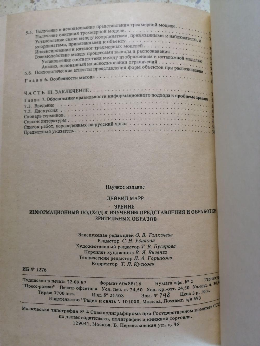 Книга посвящена информационной теории зрения Д. Марра, получившей в настоящее время широкую известность, но до сих пор на русском языке не излагавшейся. Суть теории Марра состоит в том, что в основе зрительного восприятия лежат процессы сбора, представления, обработки и распознавания информации, отражающей свойства наблюдаемого человеком реального мира. Приводятся методологические предпосылки, описание используемого информационного подхода, структура, предлагаемая для представления процесса зрительного восприятия в целом, и путь, который привел к ее формированию. Основное содержание книги составляет информационный анализ феномена зрения человека, а именно способы построения вывода (алгоритмов), позволяющего по структуре изображения судить о структуре реального мира, а также обсуждение физических ограничений и допущений, обеспечивающих возможность построения такого вывода. Значительное внимание уделяется иерархии представлений зрительной информации, способам формализации описаний изображения и элементам, из которых они могут и должны строиться,- признакам, стереозрению, использованию движения для восстановления трехмерной структуры реальной сцены по последовательности изображений и использованию результатов всех связанных со зрительным восприятием процессов для приведения изображений к виду, удобному для распознавания, и реализации последнего. Информационная теория зрения развивается в книге при сопоставлении и соединении тезисов автора с известными данными по психофизике и нейрофизиологии зрительной системы человека и методами обработки информации, используемыми в автоматизированных системах обработки и распознавания изображений.