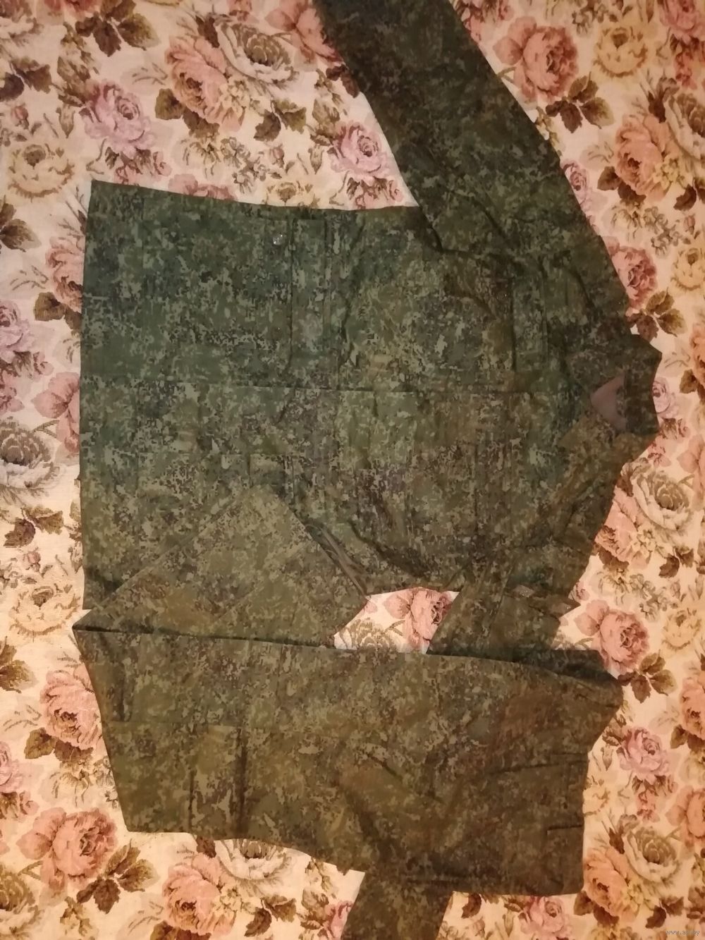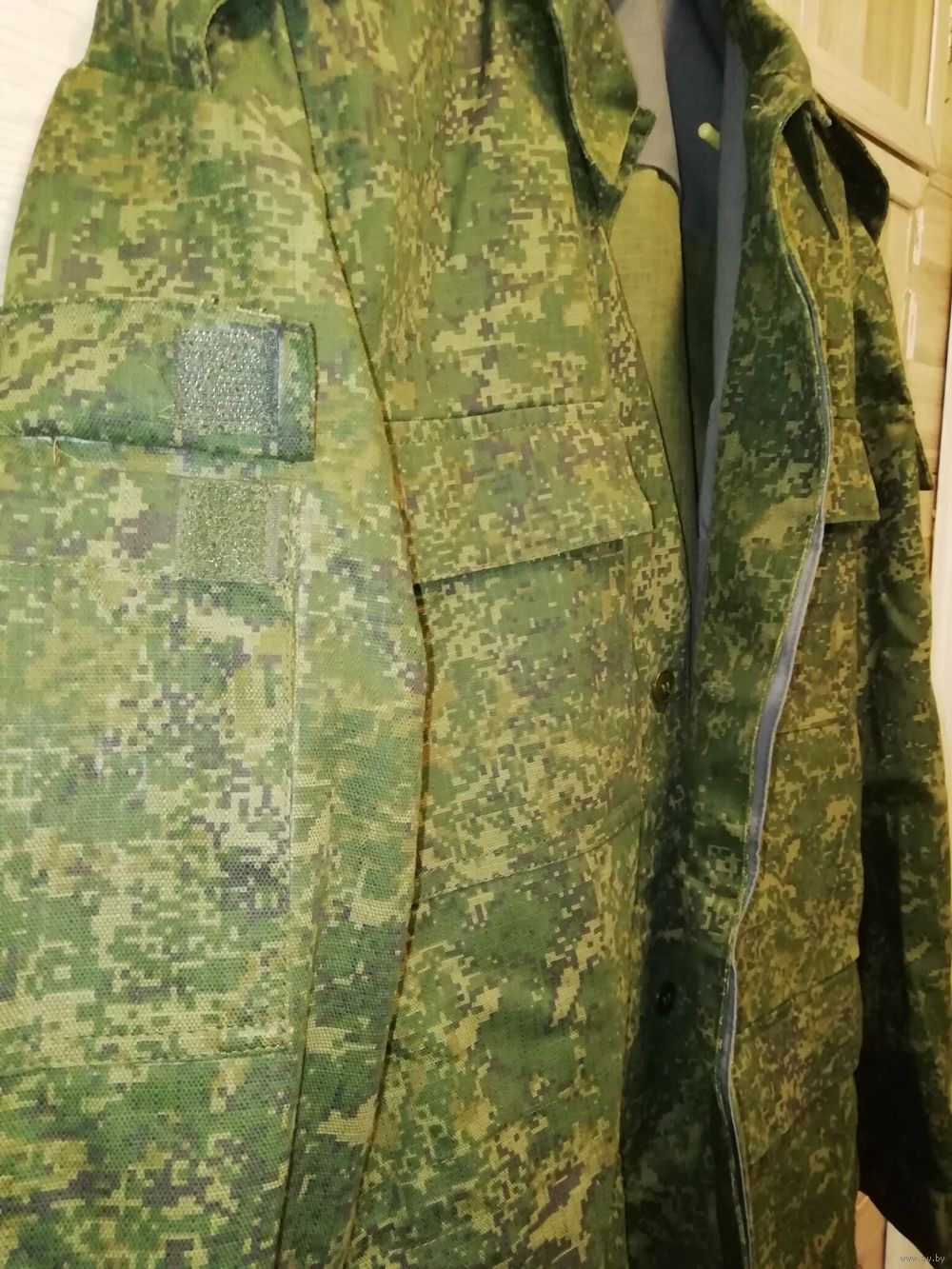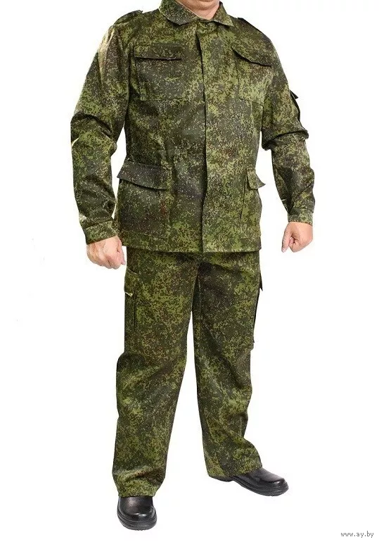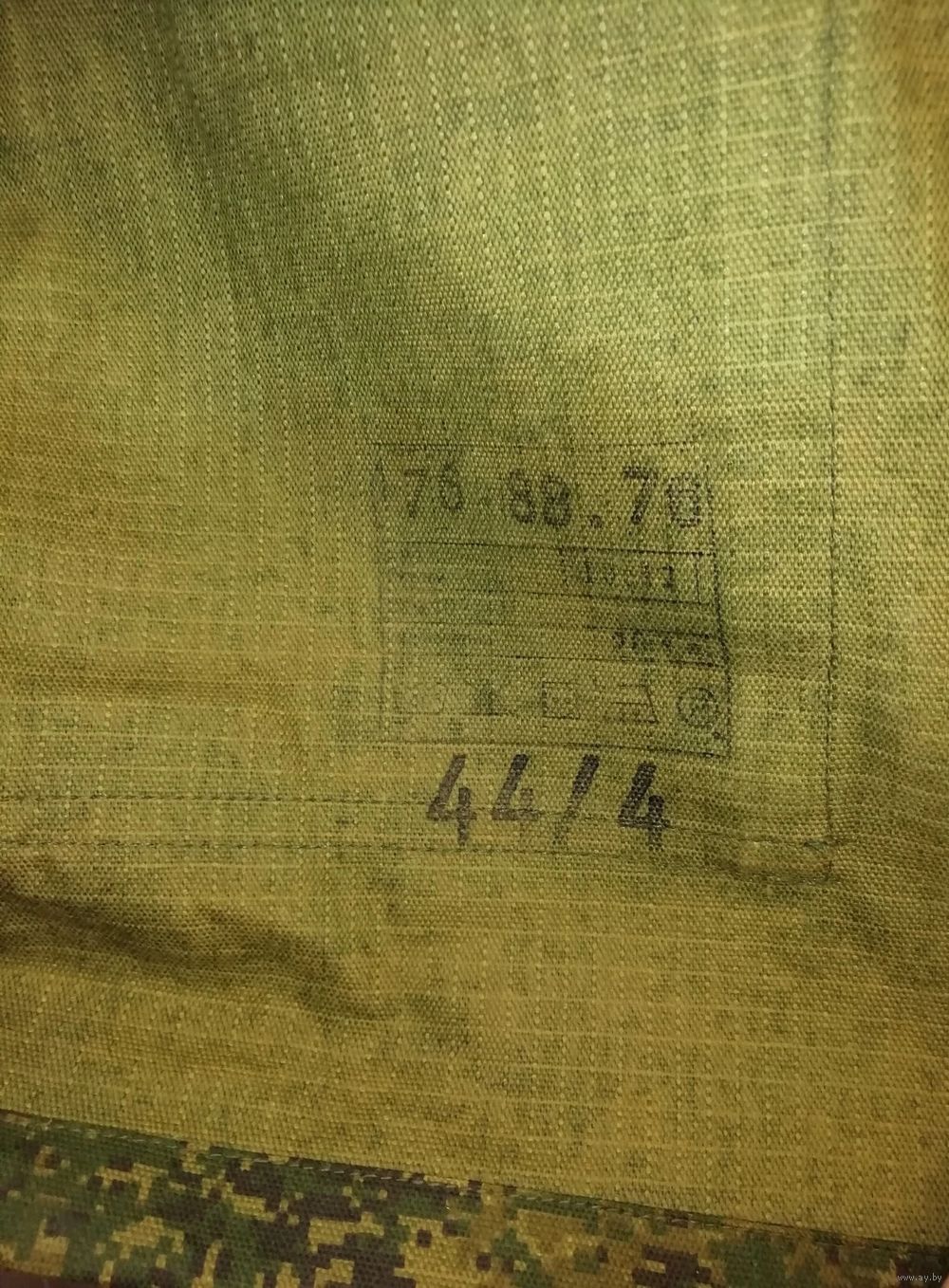Структура материала – рипстоп (износостойкий). Материал – смесовая ткань: 50% хлопок, 50% полиэстер. Камуфляжный зеленый цвет. Страна происхождения – Республика Беларусь. Приблизительно 2015 год.