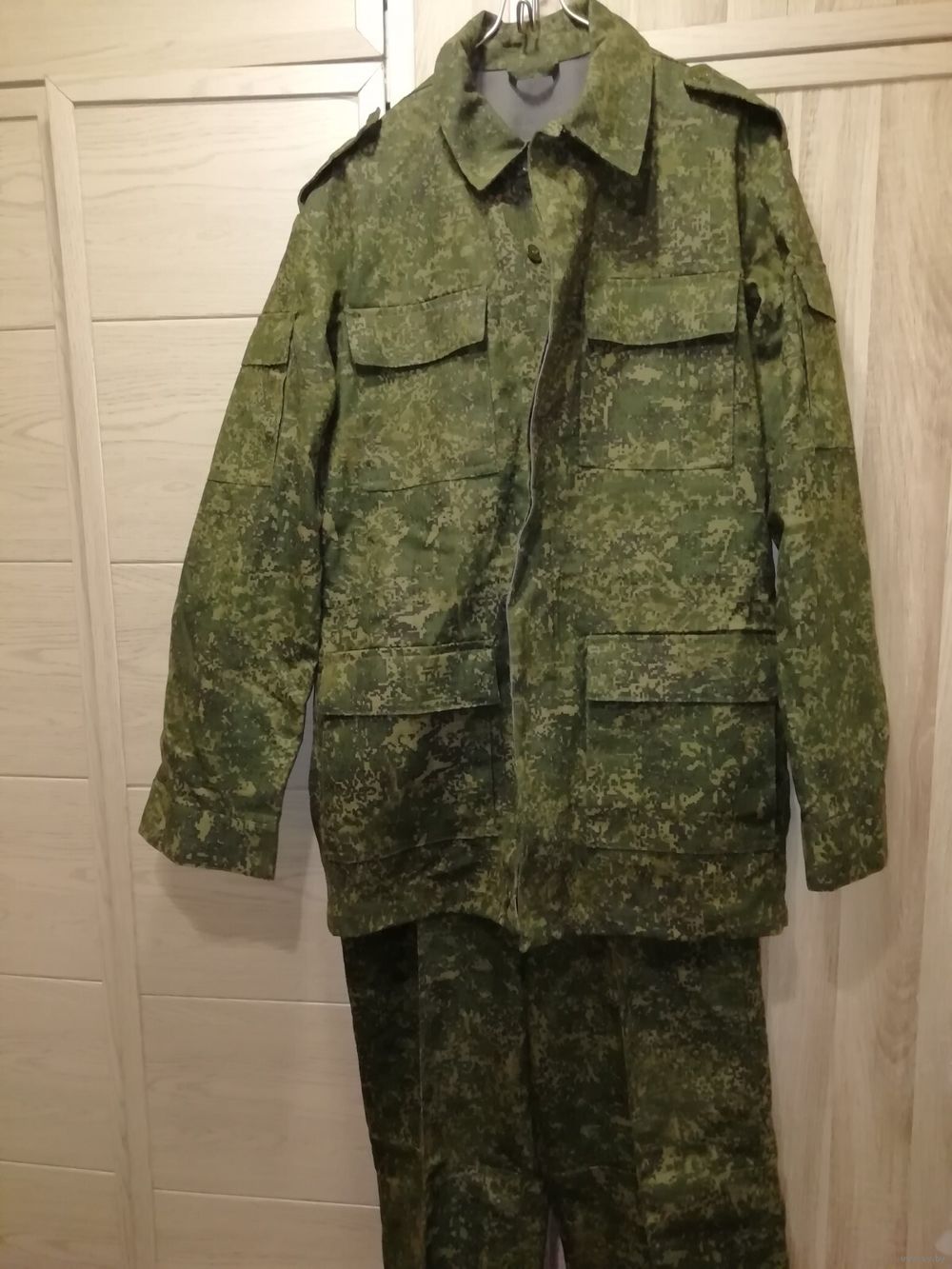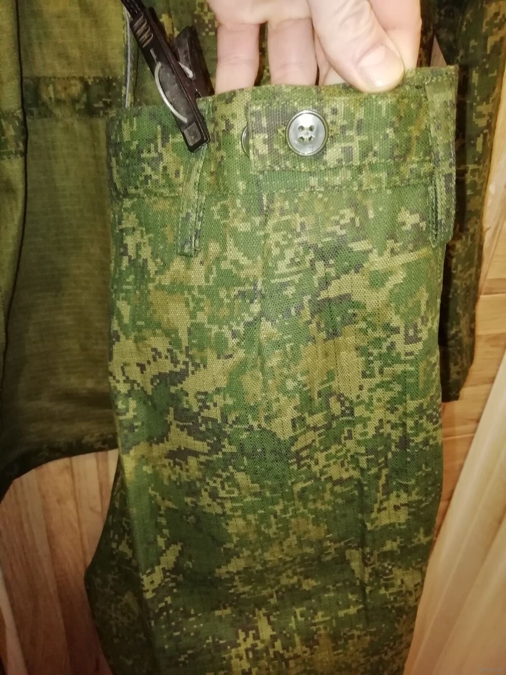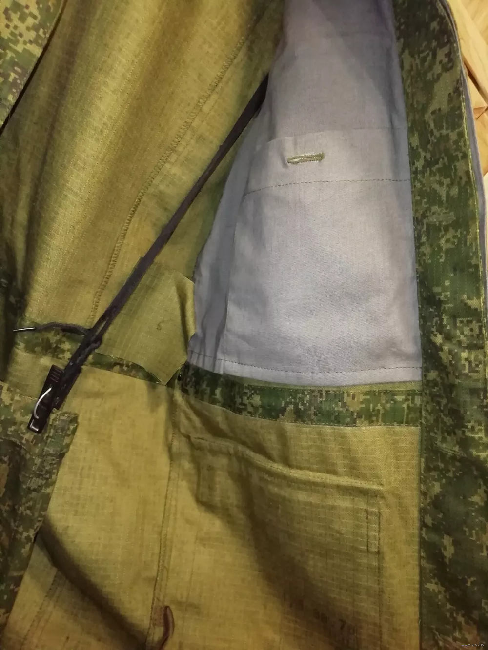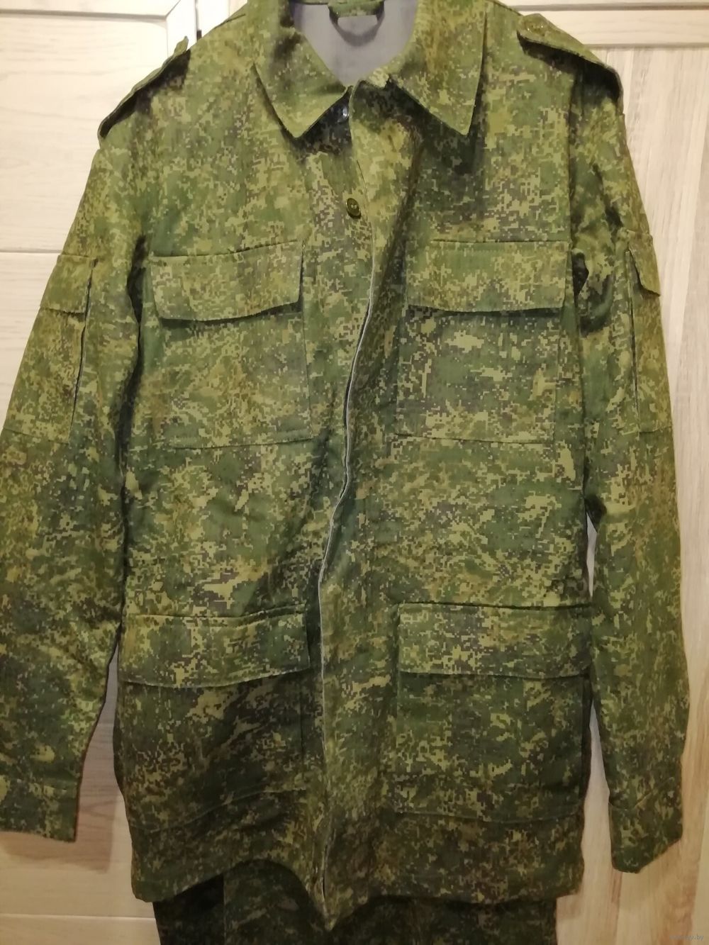 Структура материала – рипстоп (износостойкий). Материал – смесовая ткань: 50% хлопок, 50% полиэстер. Камуфляжный зеленый цвет. Страна происхождения – Республика Беларусь. Приблизительно 2015 год.
