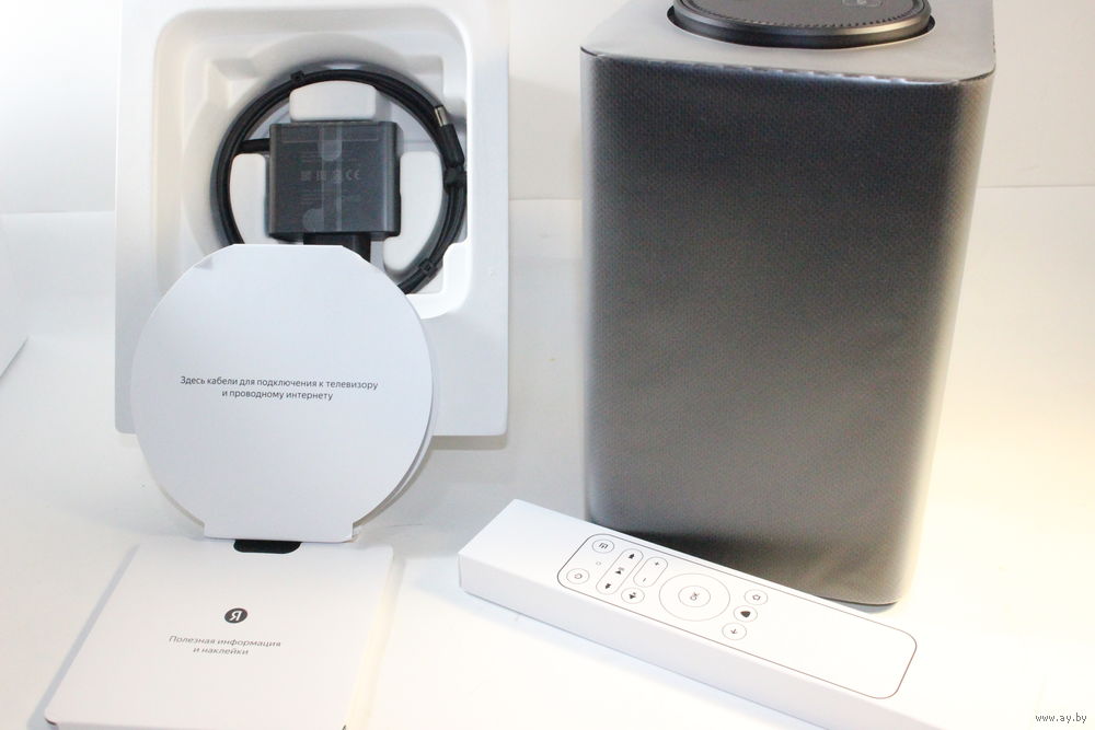 Коробка, колонка, блок питания, кабель ethernet, кабель HDMI, мануал