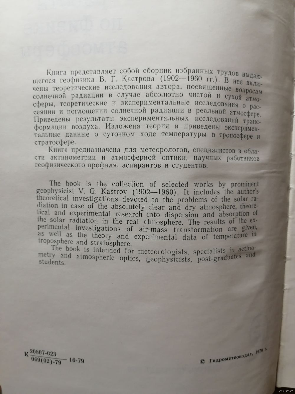 Книга представляет собой сборник избранных трудов выдающегося геофизика В.Г.Кастрова. В нее включены теоретические исследования автора, посвященные вопросам солнечной радиации в случае абсолютно чистой и сухой атмосферы, теоретические и экспериментальные исследования о рассеянии и поглощении солнечной радиации в реальной атмосфере. Приведены результаты экспериментальных исследований трансформации воздуха. Изложена теория и приведены экспериментальные данные о суточном ходе температуры в тропосфере и стратосфере.