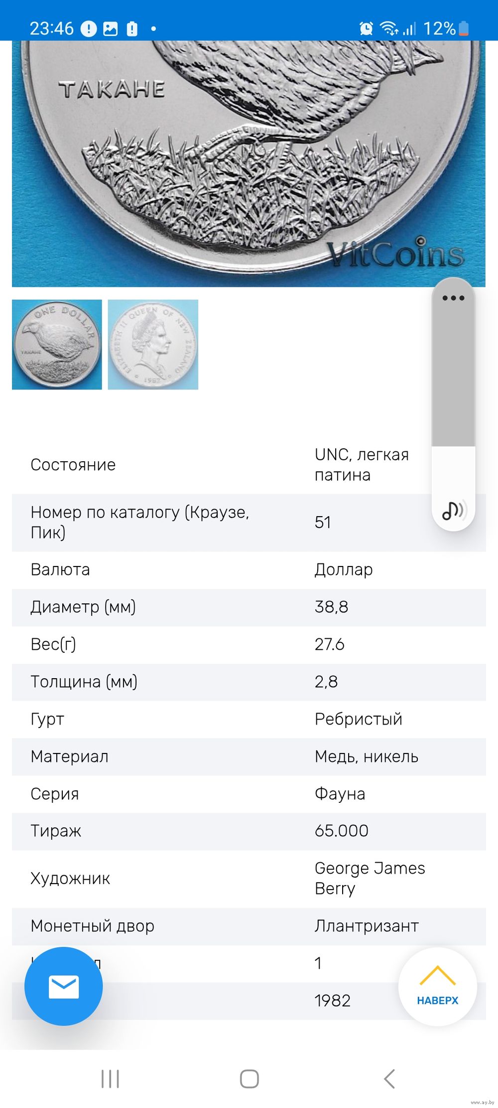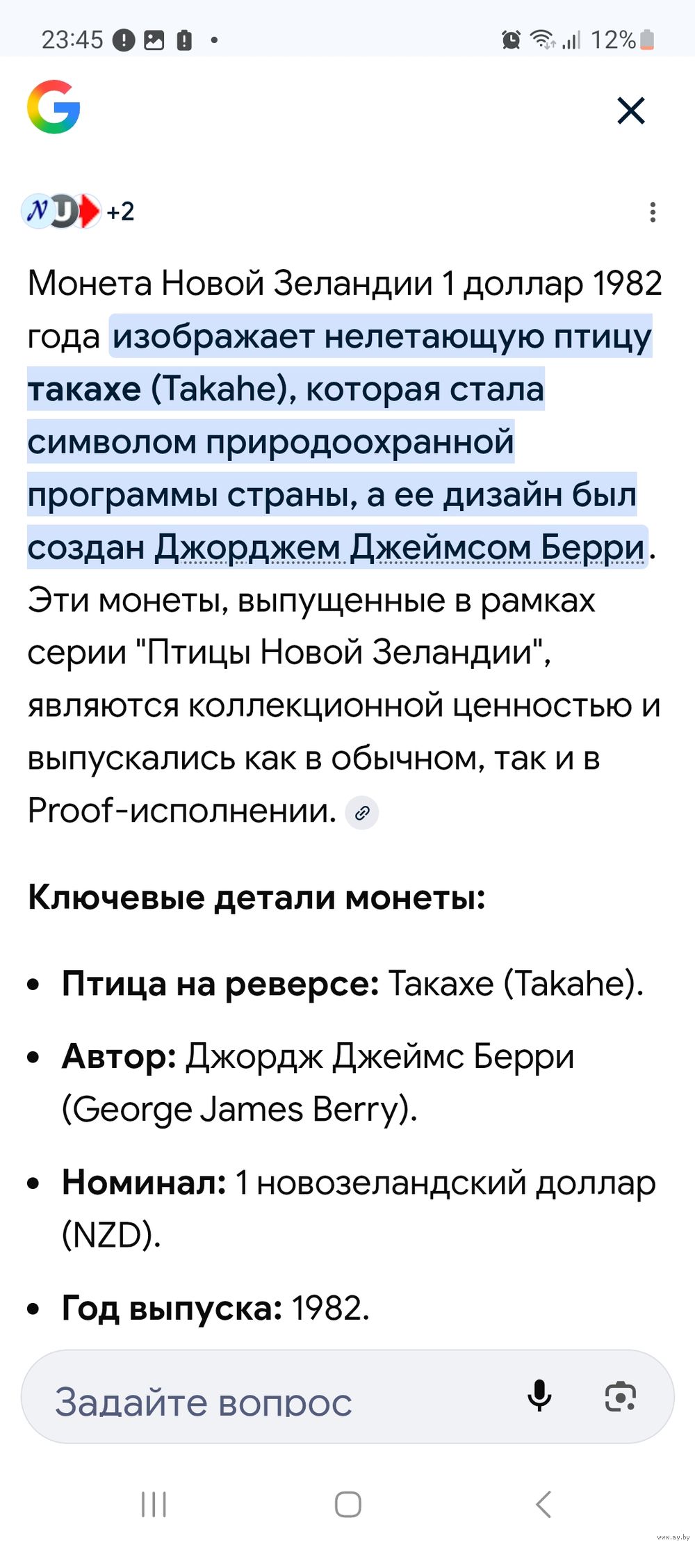 Новая Зеландия 1 доллар 1982 г ( - фауна - Птицы Новой Зеландии - Такахе тираж 65 тыс)