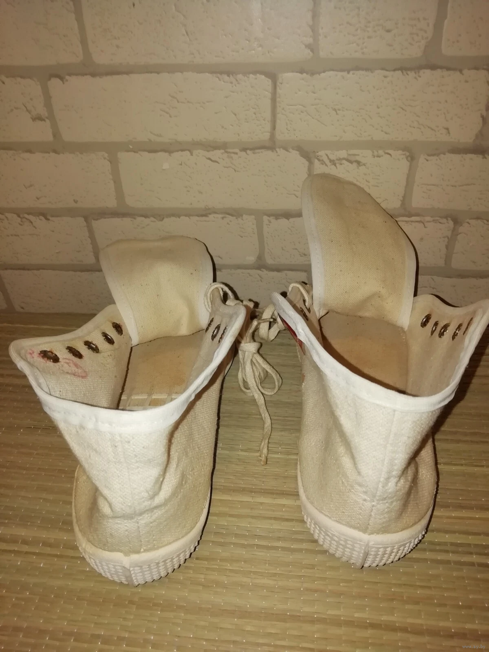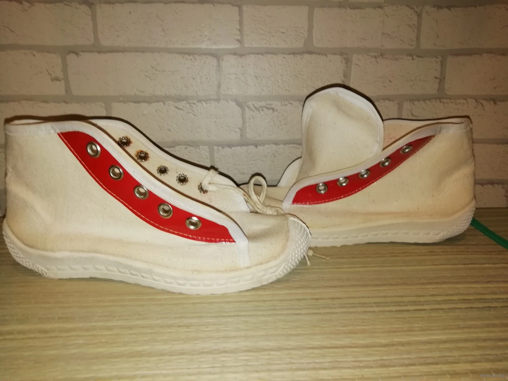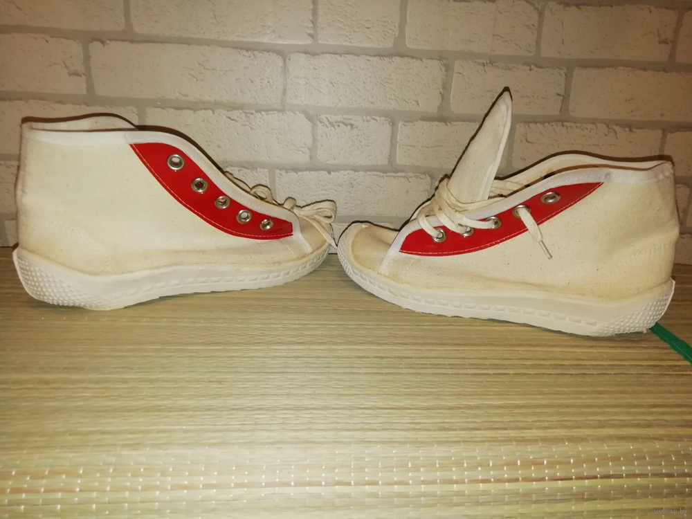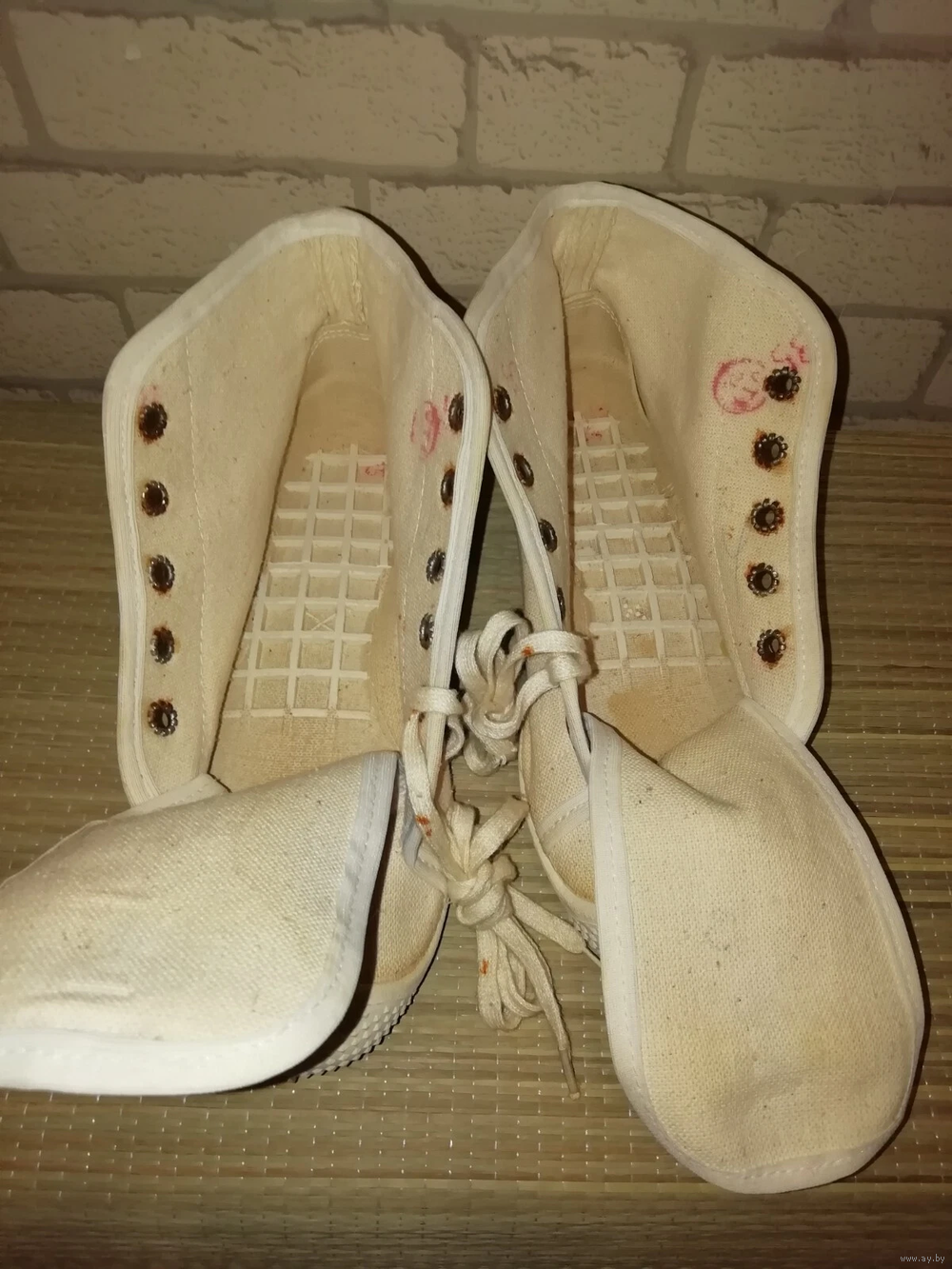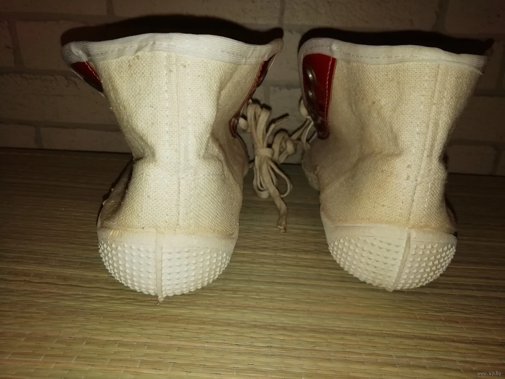 Кеды не использовались. Материал прочный, тисненый. Вставки из искусственной кожи. Чистые. Стельки отсутствуют. Размер, по данным производителя, 22,5 сантиметра. 35 размер . На подошве указана марка завода, год изготовления 1991, номер государственного стандарта качества 1955-88 (ГОСТ). Завод «Кричевский завод резиновых изделий», Белорусская Советская Социалистическая Республика.
