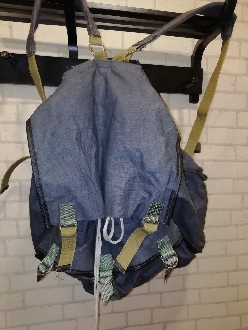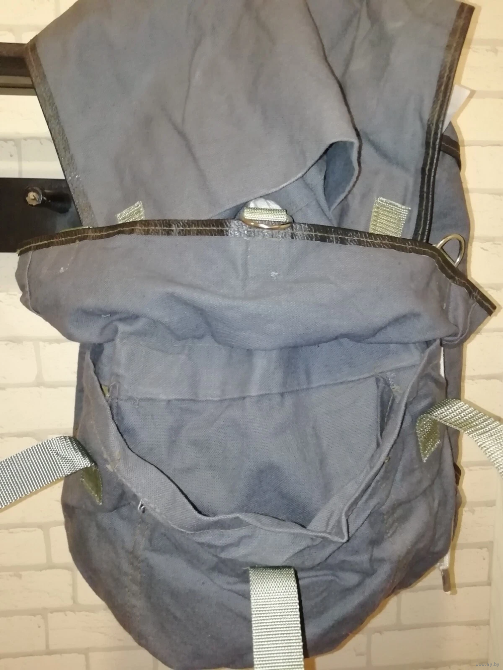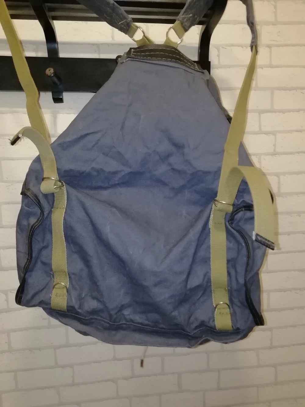 Плотный брезент. Водонепроницаемая ткань. Черный цвет. Прочные лямки. 1 внутренний карман. Ременная фиксация, как у дорожной сумки. Два средних кармана и один большой посередине. Дополнительные крючки для снаряжения.