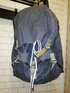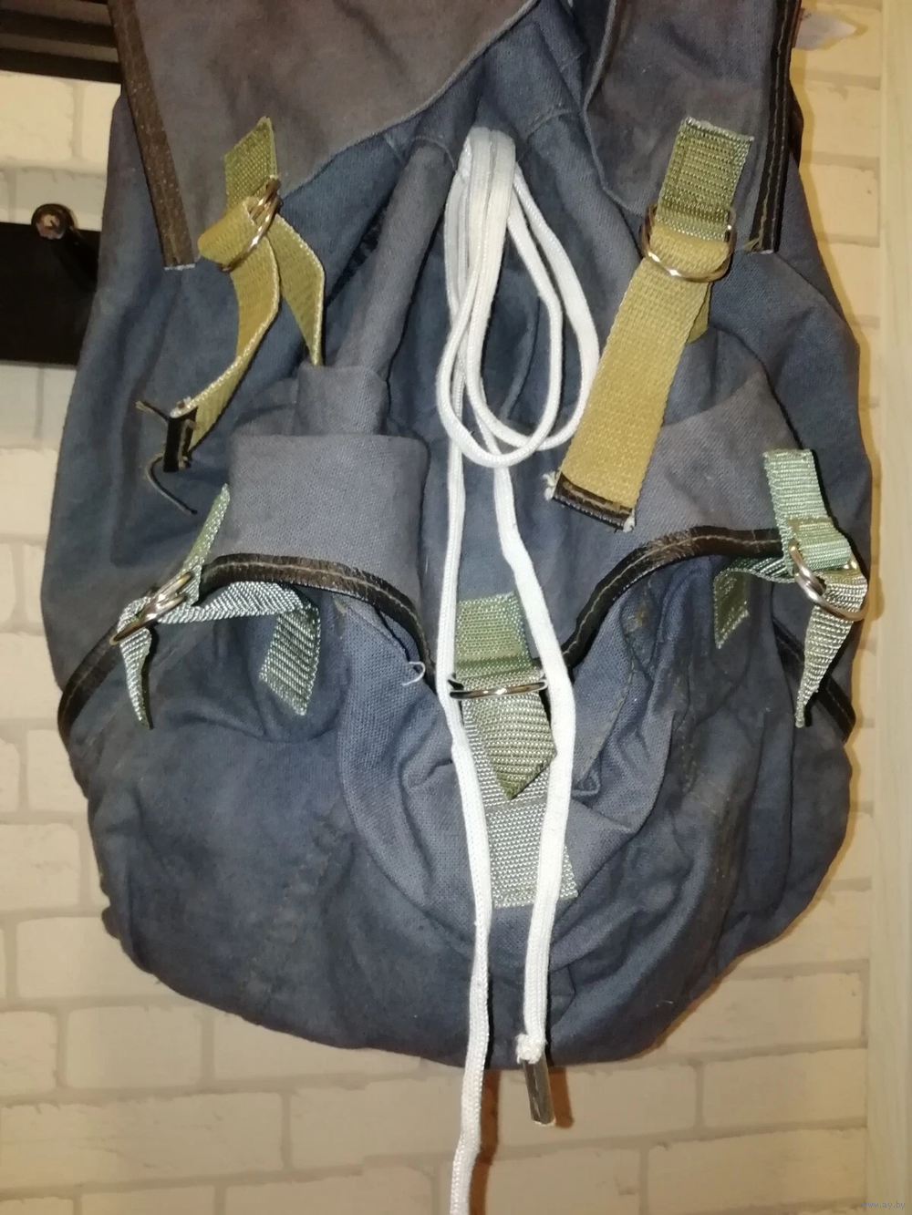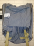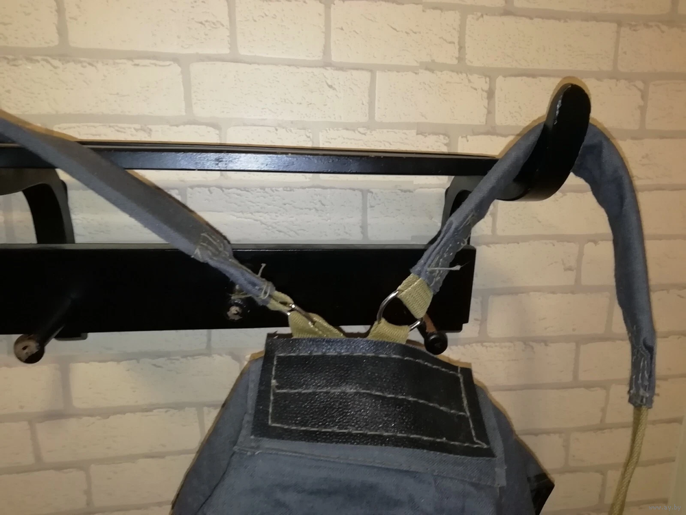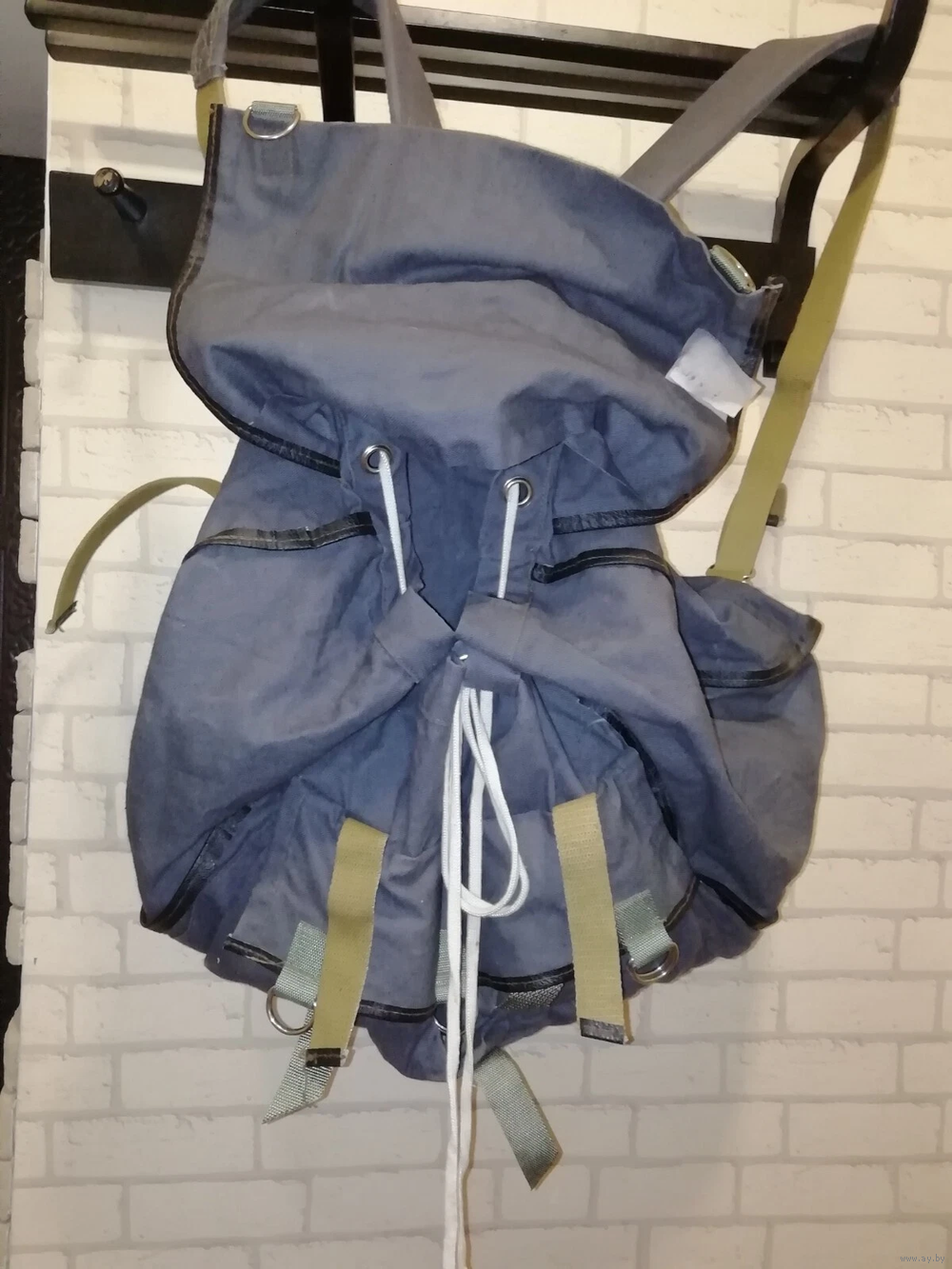 Плотный брезент. Водонепроницаемая ткань. Черный цвет. Прочные лямки. 1 внутренний карман. Ременная фиксация, как у дорожной сумки. Два средних кармана и один большой посередине. Дополнительные крючки для снаряжения.