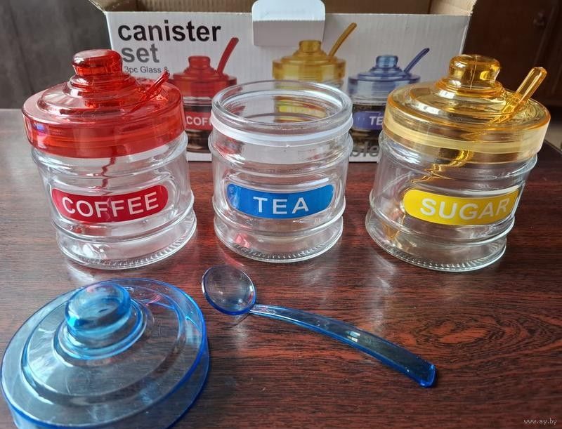 Продается набор баночек для чая, кофе и сахара. Баночки стеклянные, крышечки и ложки - пластик. Новый.
