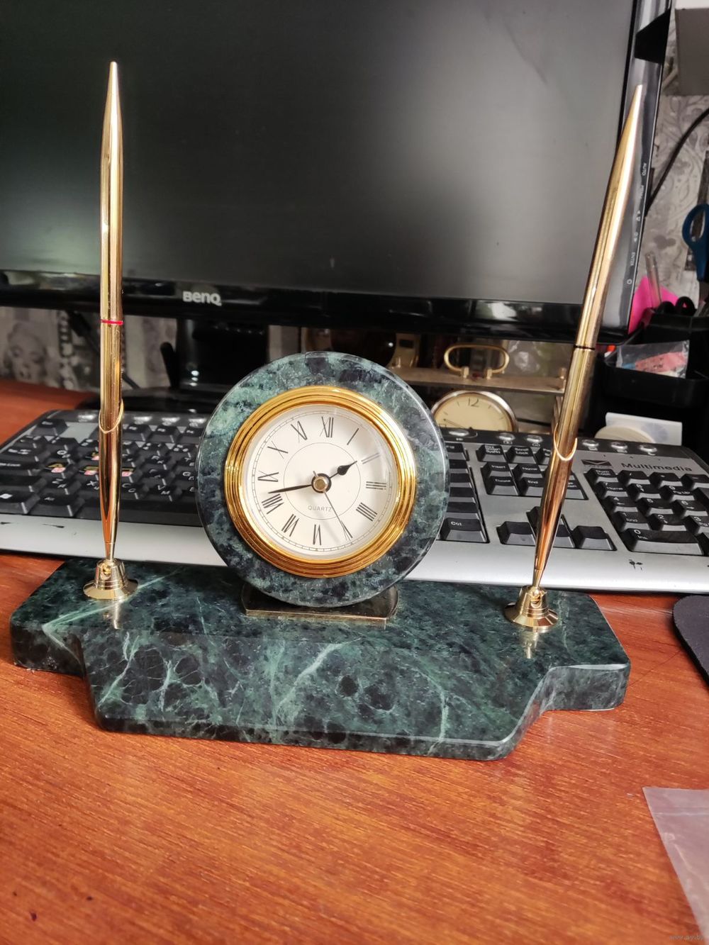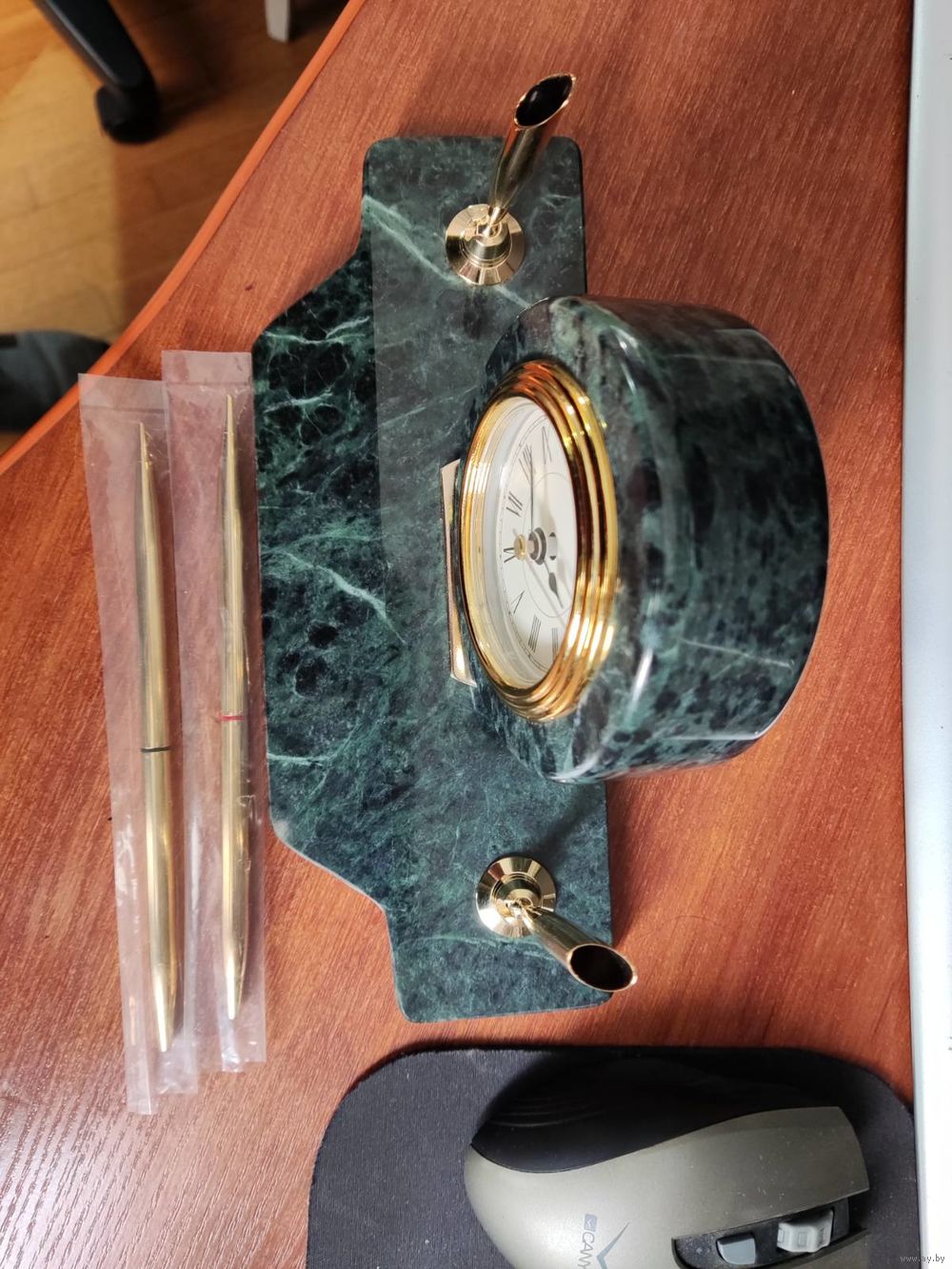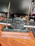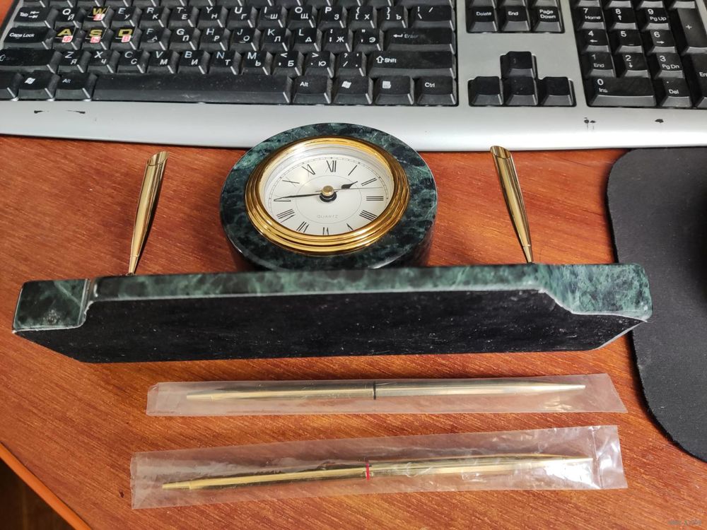 Новый настольный письменный прибор с часами (кварц). Бронза. Камень змеевик. Ручки шариковые заправлены (красный, синий). Размеры: 23 х 9 х 11(h) см. Великолепный подарок руководителю!