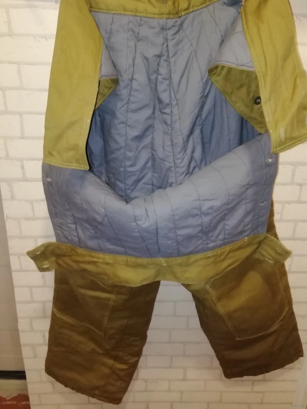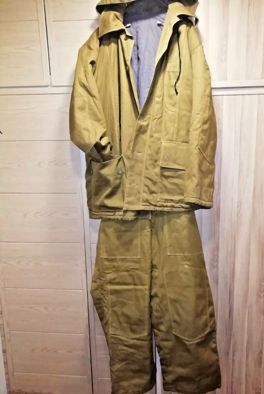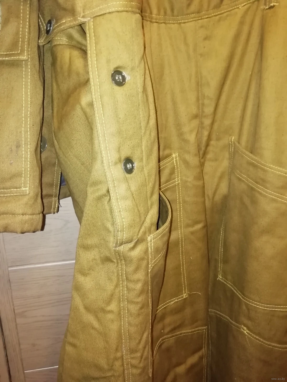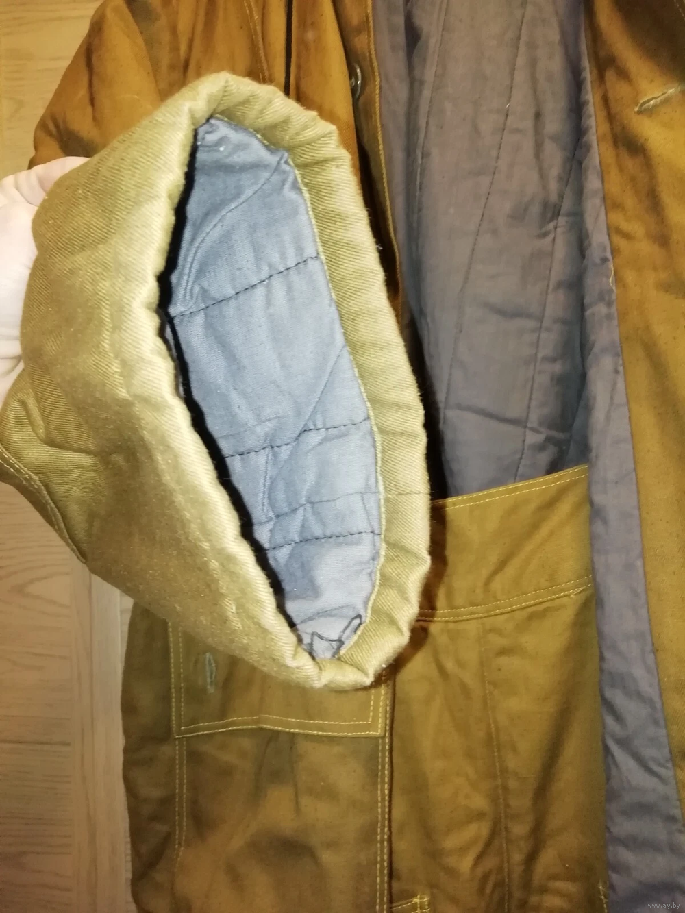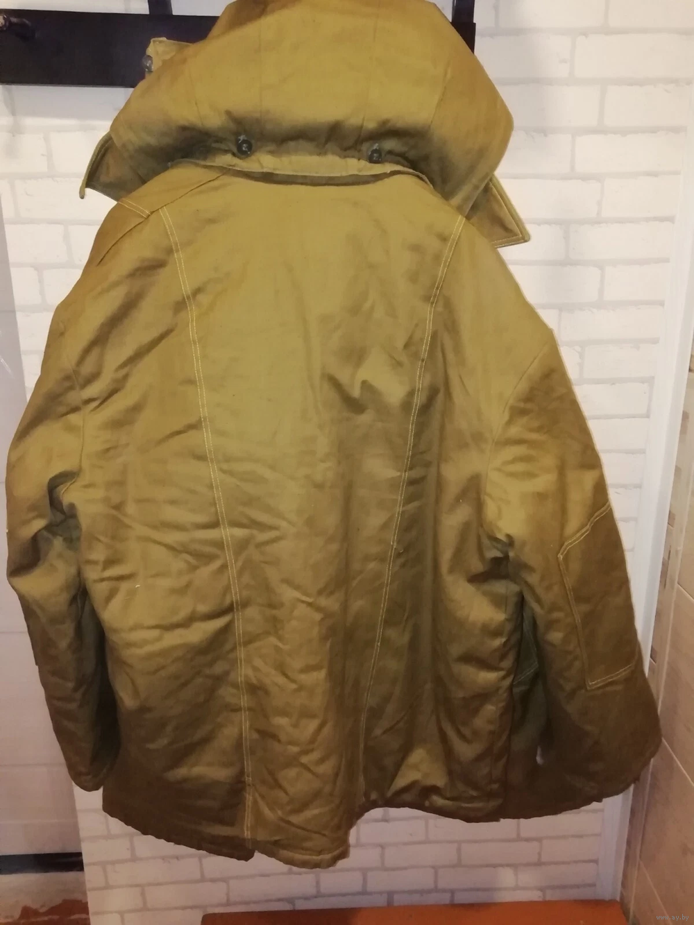 Куртка. Ширина груди 64 см. Ширина плеч 56 сантиметров. Длина рукава 60 сантиметров. Длина спереди 77 сантиметров. Длина сзади 80 сантиметров. На груди карман для ножа. Размер 18*6 сантиметров. Боковые карманы на пуговицах. Размер кармана 20*24 сантиметра.