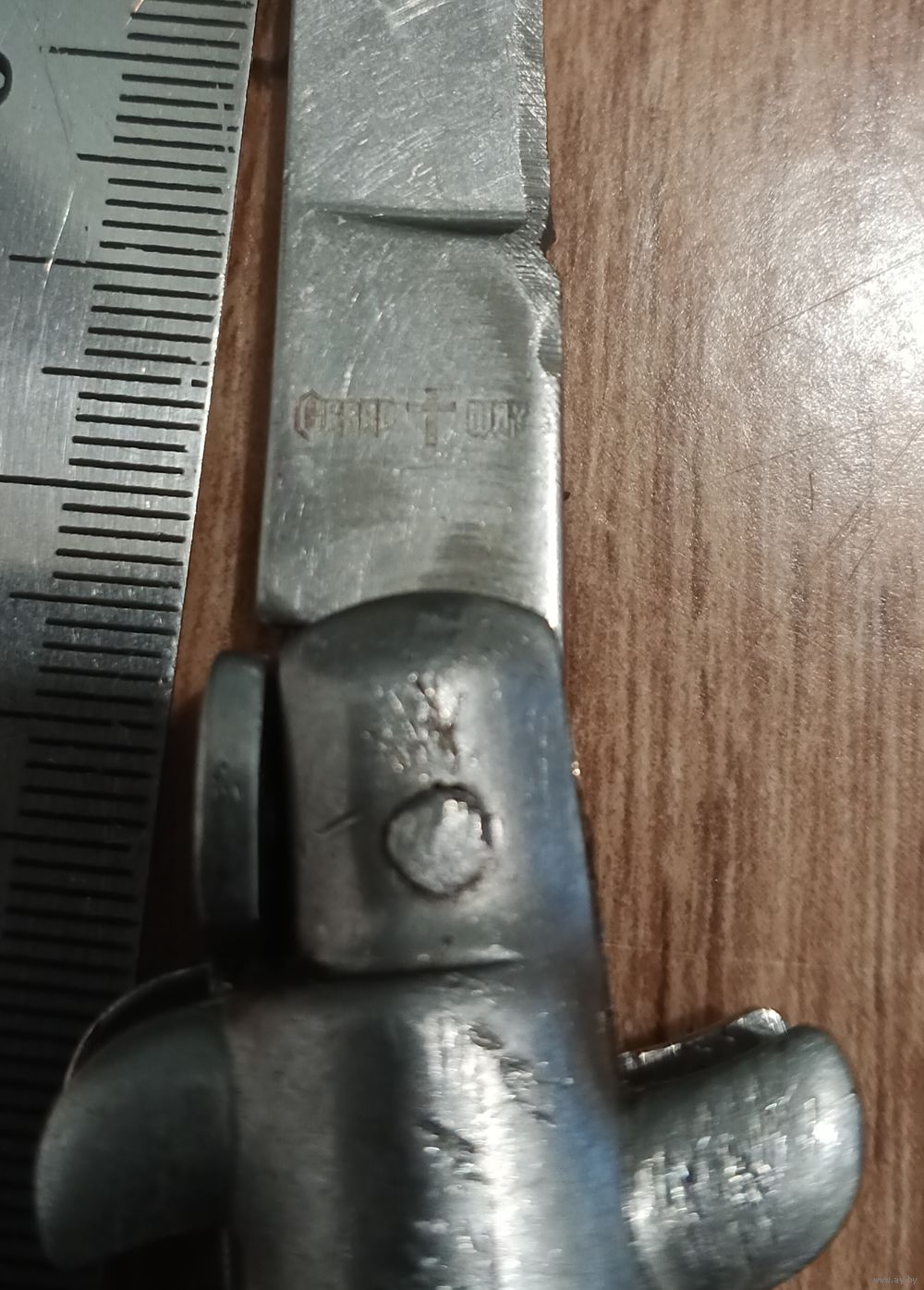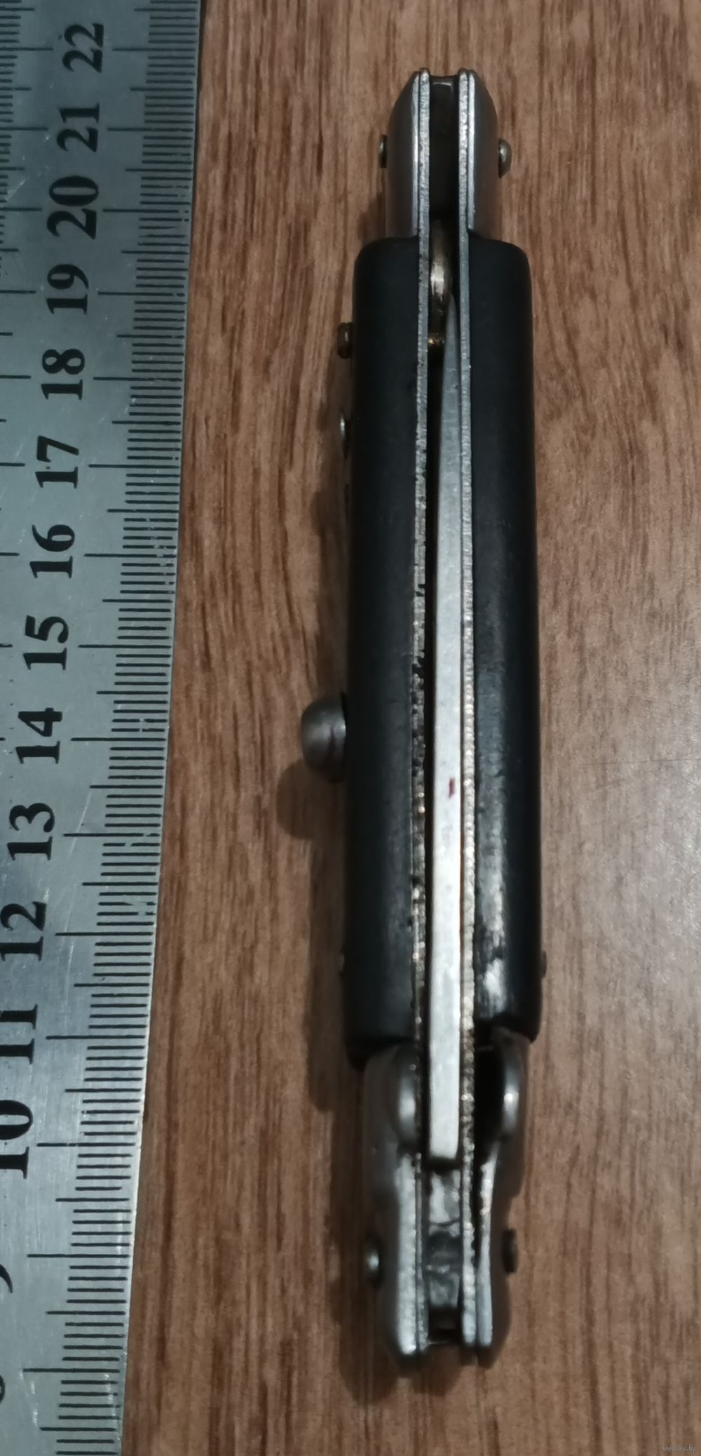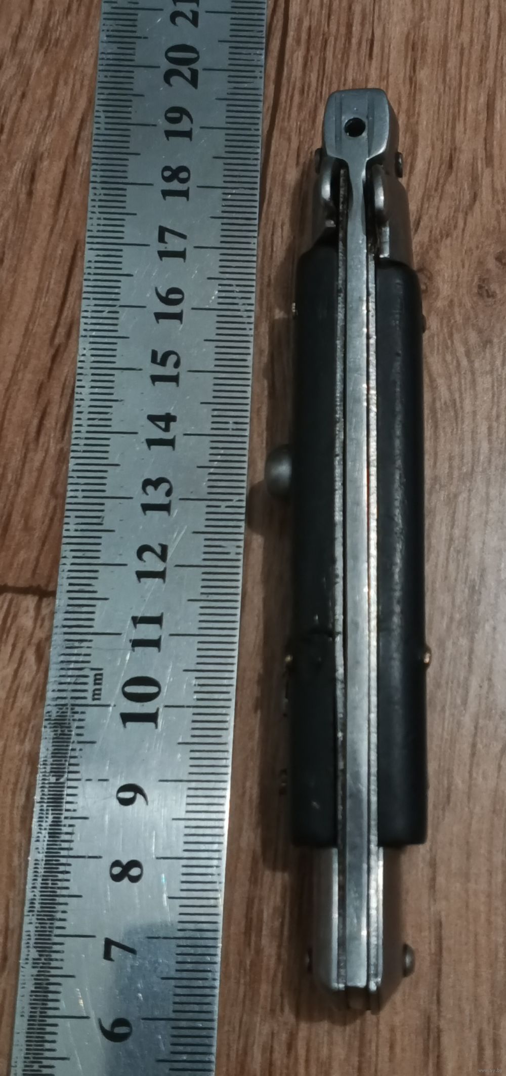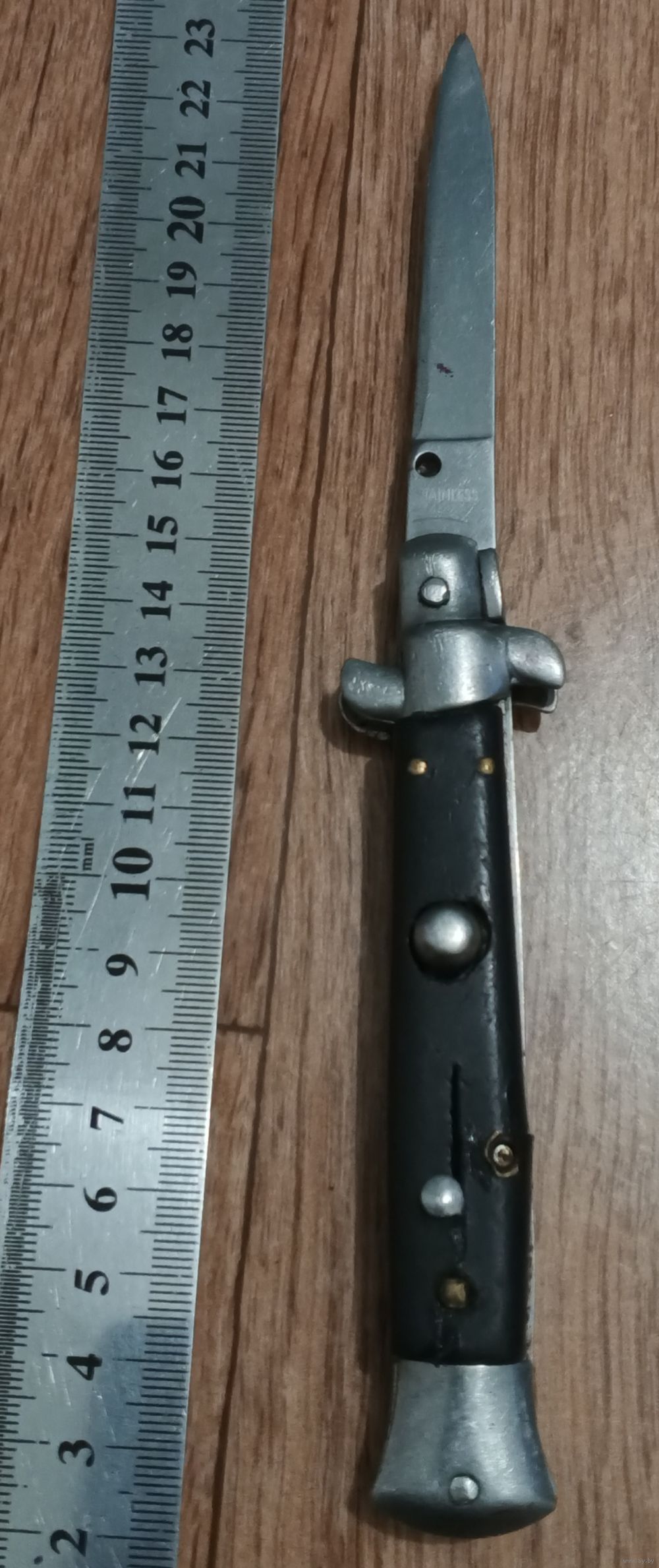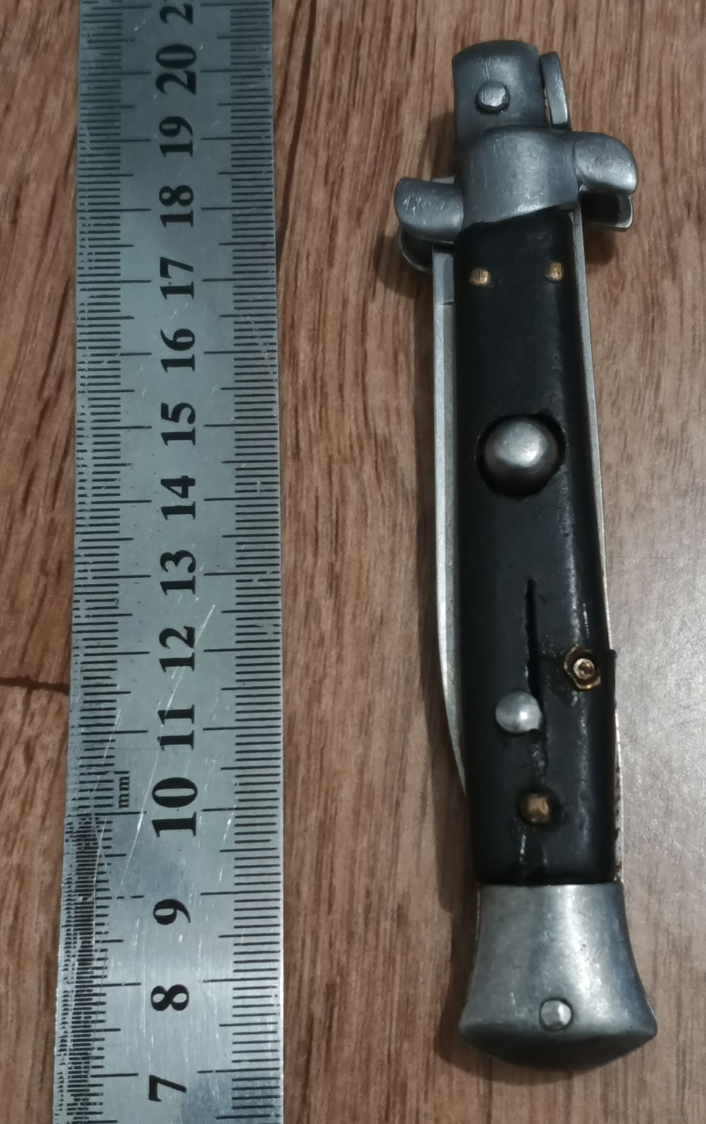 Нож с кнопкой, есть предохранитель. Лезвие вылетает при нажатии на кнопку, но не фиксируется. Под восстановление.