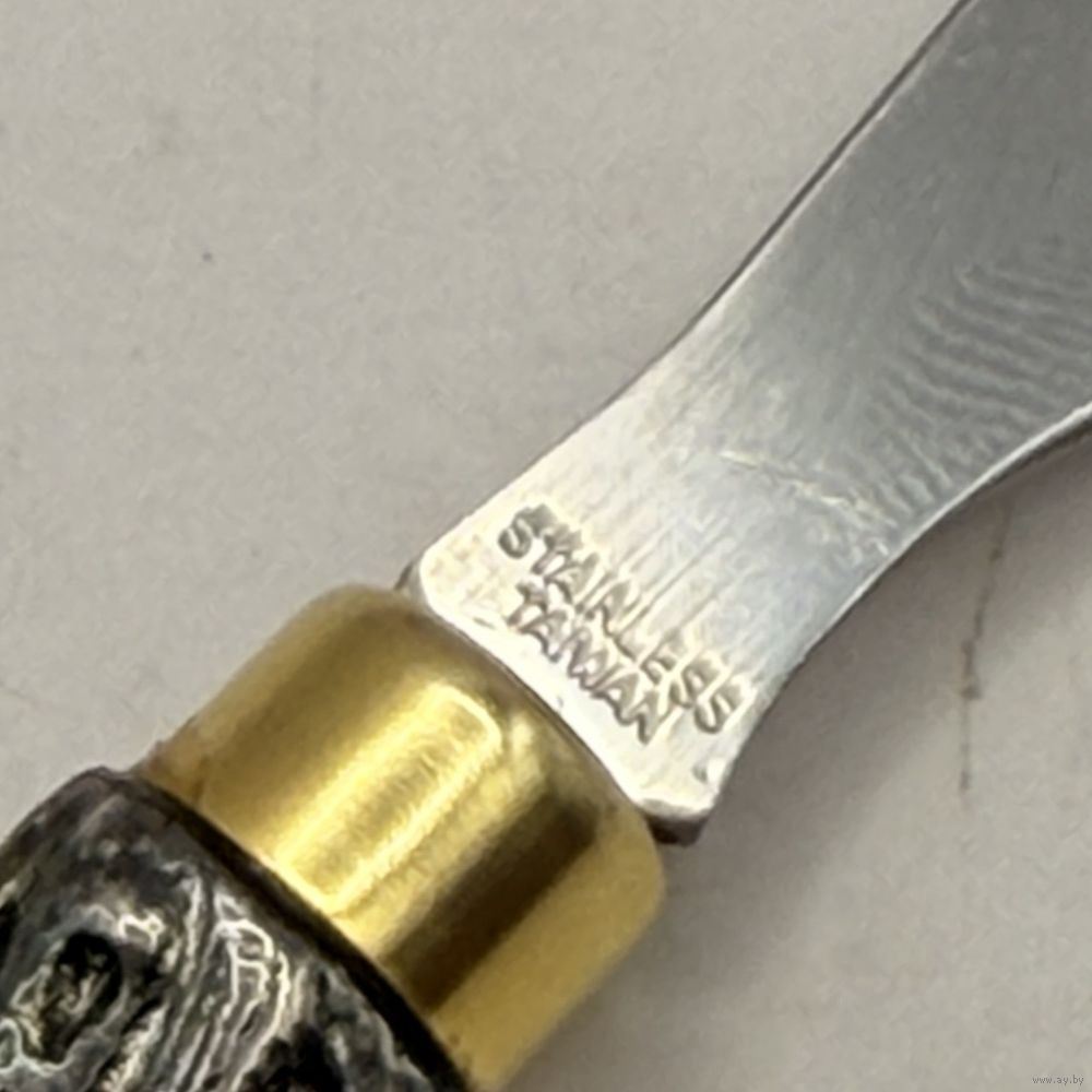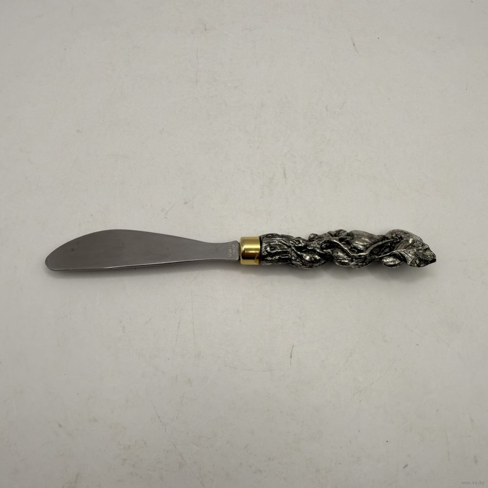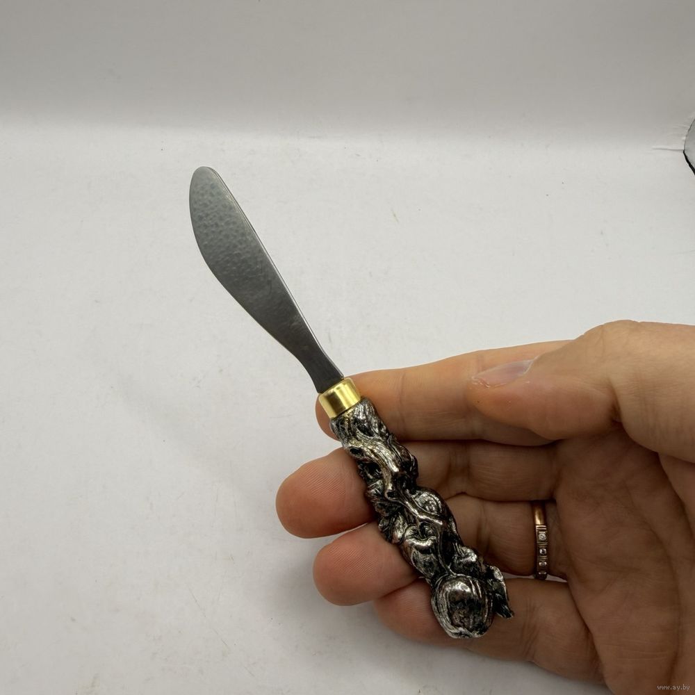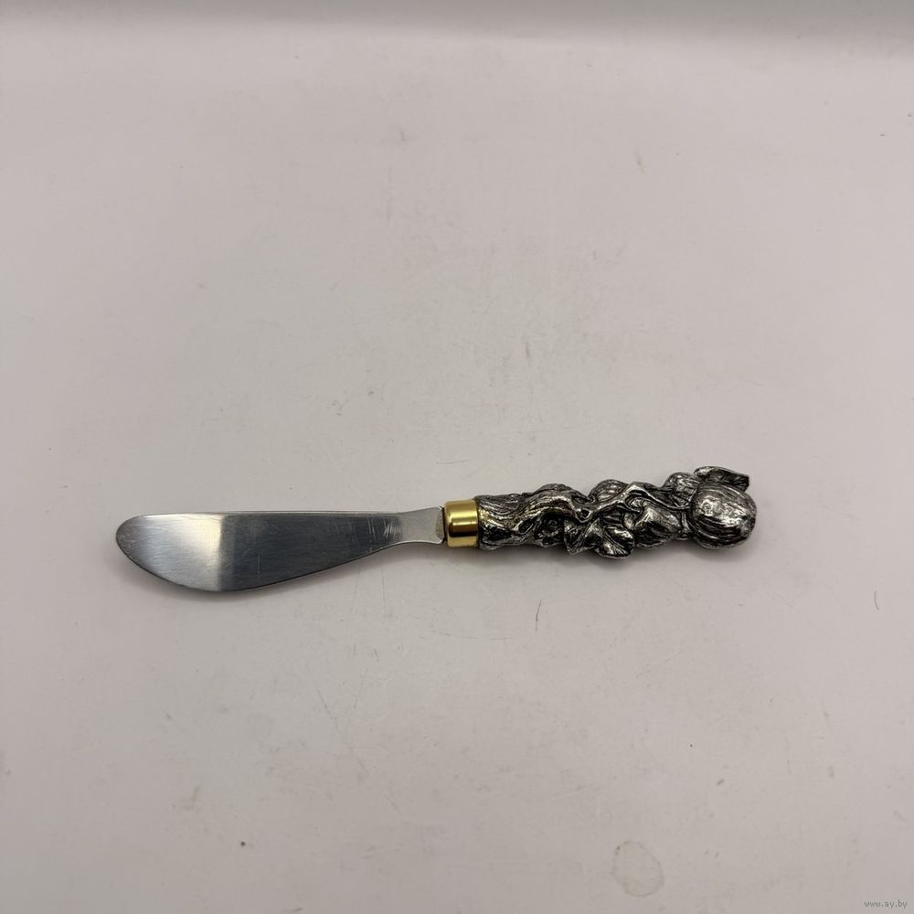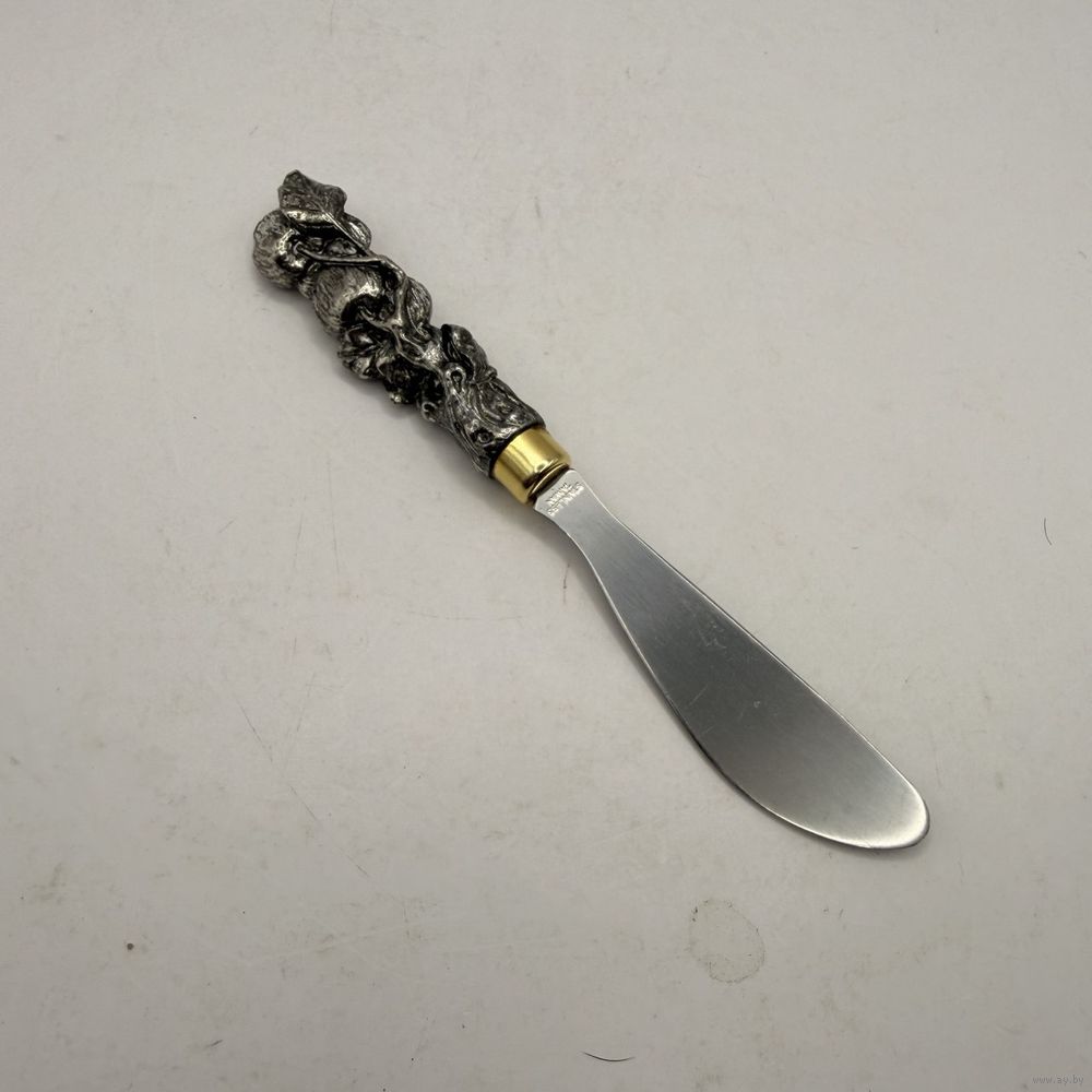 Нож для масла или паштета из нержавеющей стали с декоративной ручкой из посеребренного металлического сплава в виде ветки с объемными плодами яблок. Тайвань. Клейма на полотне ножа. Винтаж 1990-х. Длина 13,5 см. Вес 70 г. Естественная патина.
