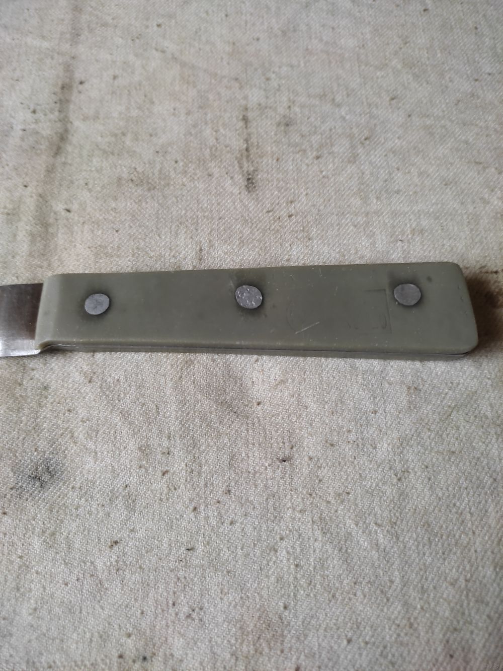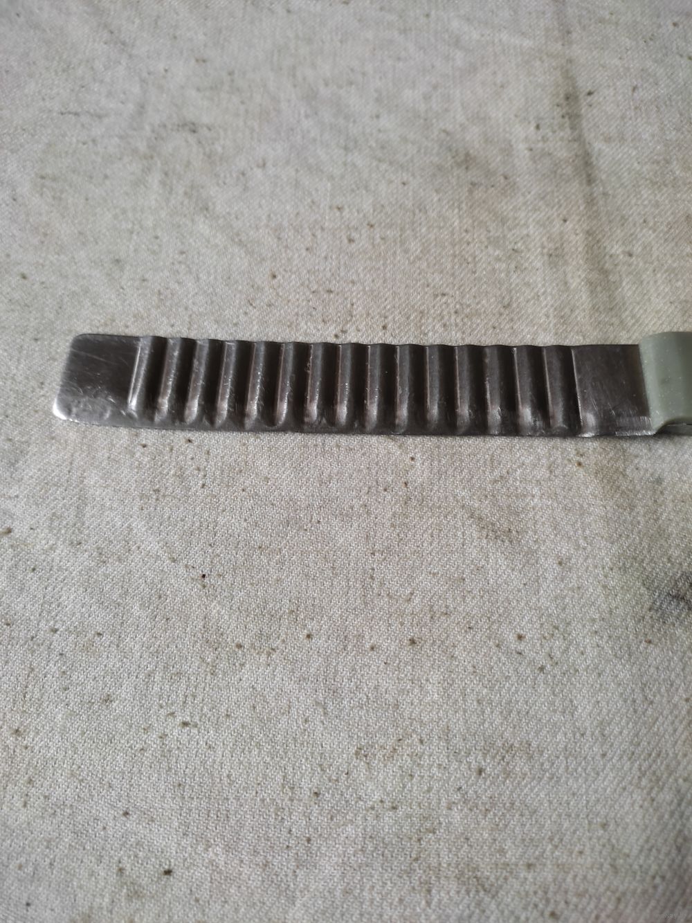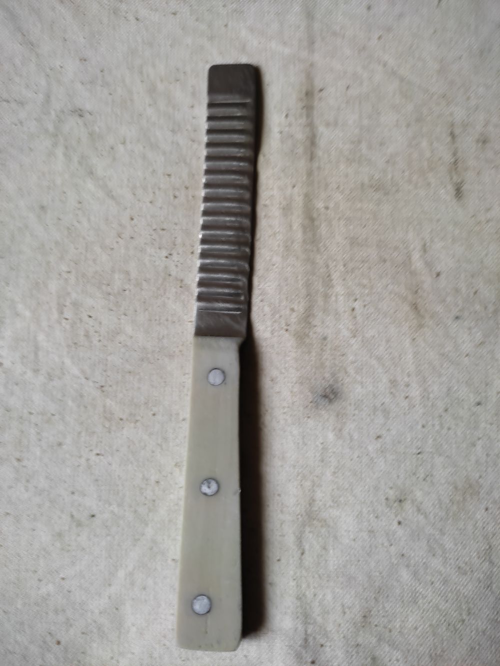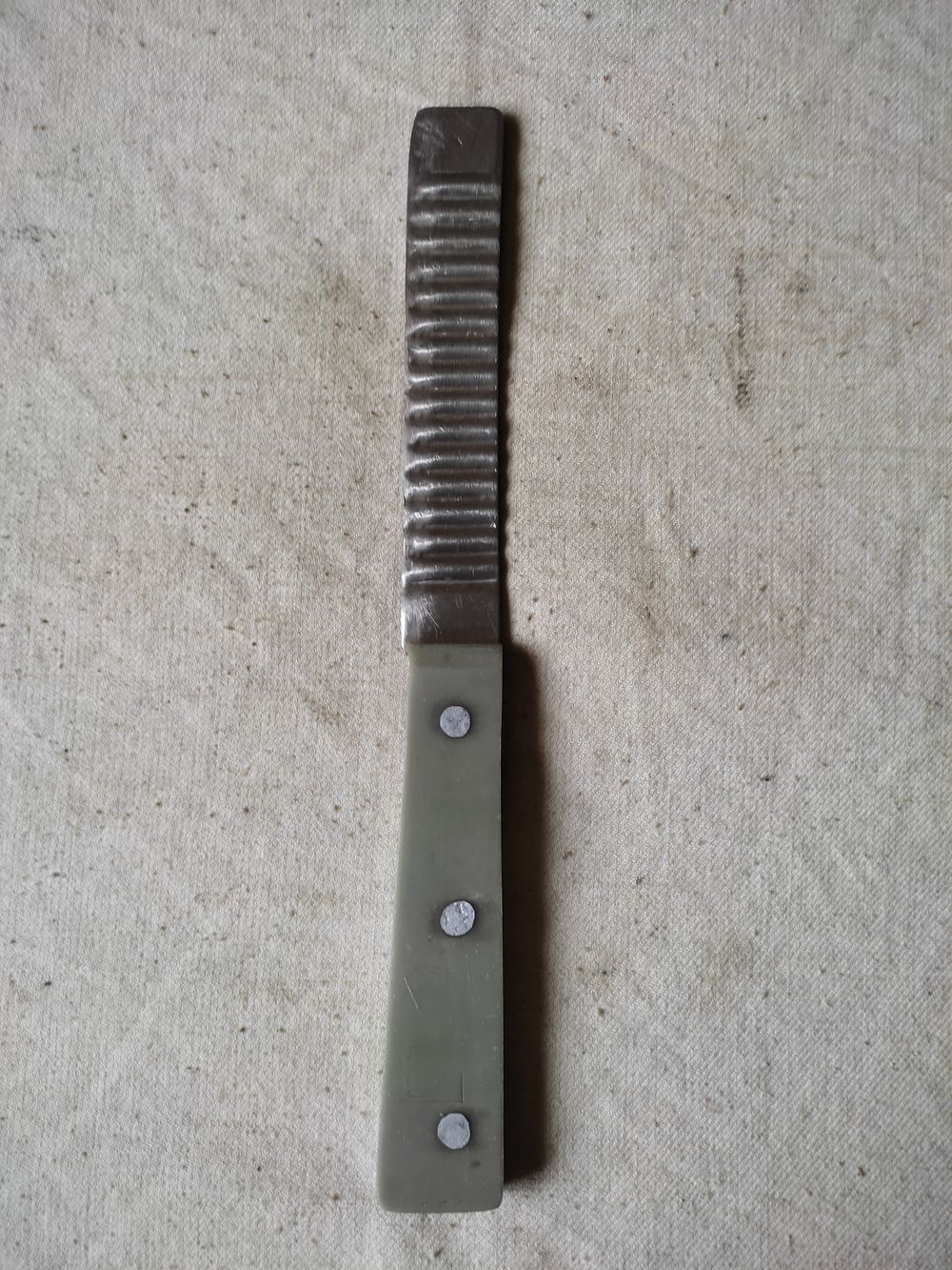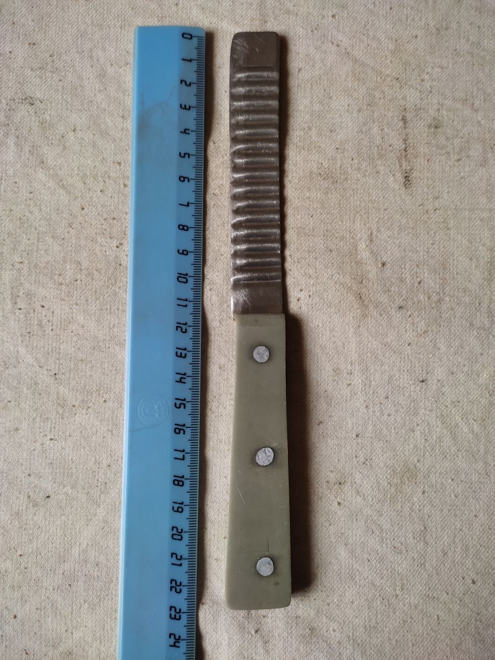 Нож для масла , сыра , СССР. Рифленый , волнообразный. Чисто вымыт , хорошее состояние. Длина - 23 см , длина рабочей части - 12 см , вес - 79 гр. Пластмассовые накладки. Высылаю : Белпочта , Европочта.
