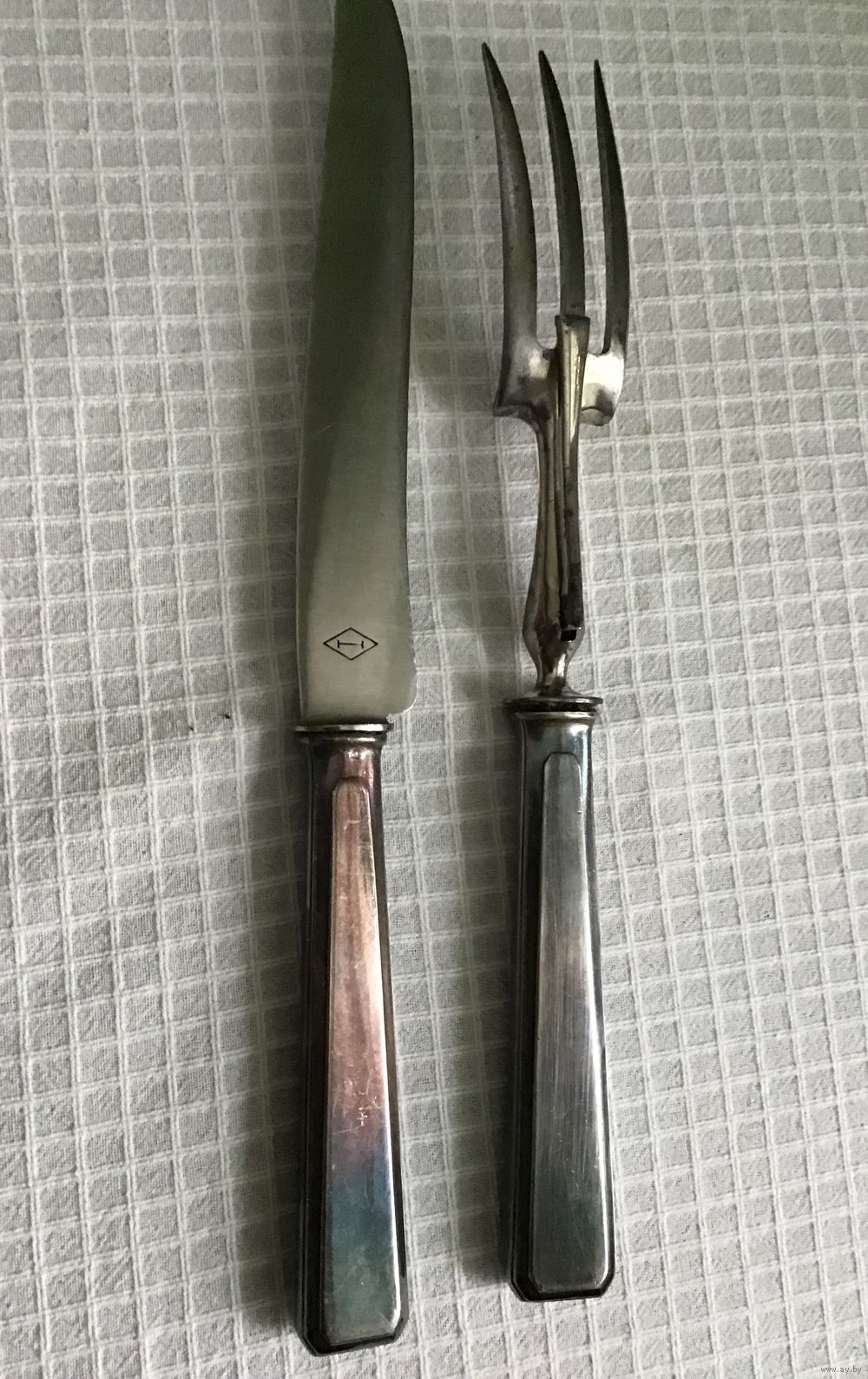 Набор - траншерная (фр. tranhcer) вилка и нож. Используется для порционной нарезки мяса и дичи. Франция, начало 20 века. Клеймо. Ручка - посеребрение , материал вилки - кованая сталь. Длина вилки 28 см, ножа 31 см. Состояние хорошее.