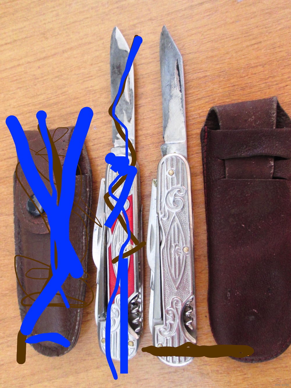 нож,,, В идеальном родном состоянии, крепкий ,все щелкает, ни чего не шатается, лезвие не сточено .На лезвии небольшая патина от времени Нож с красной рукоятью отсутствует !!!!!