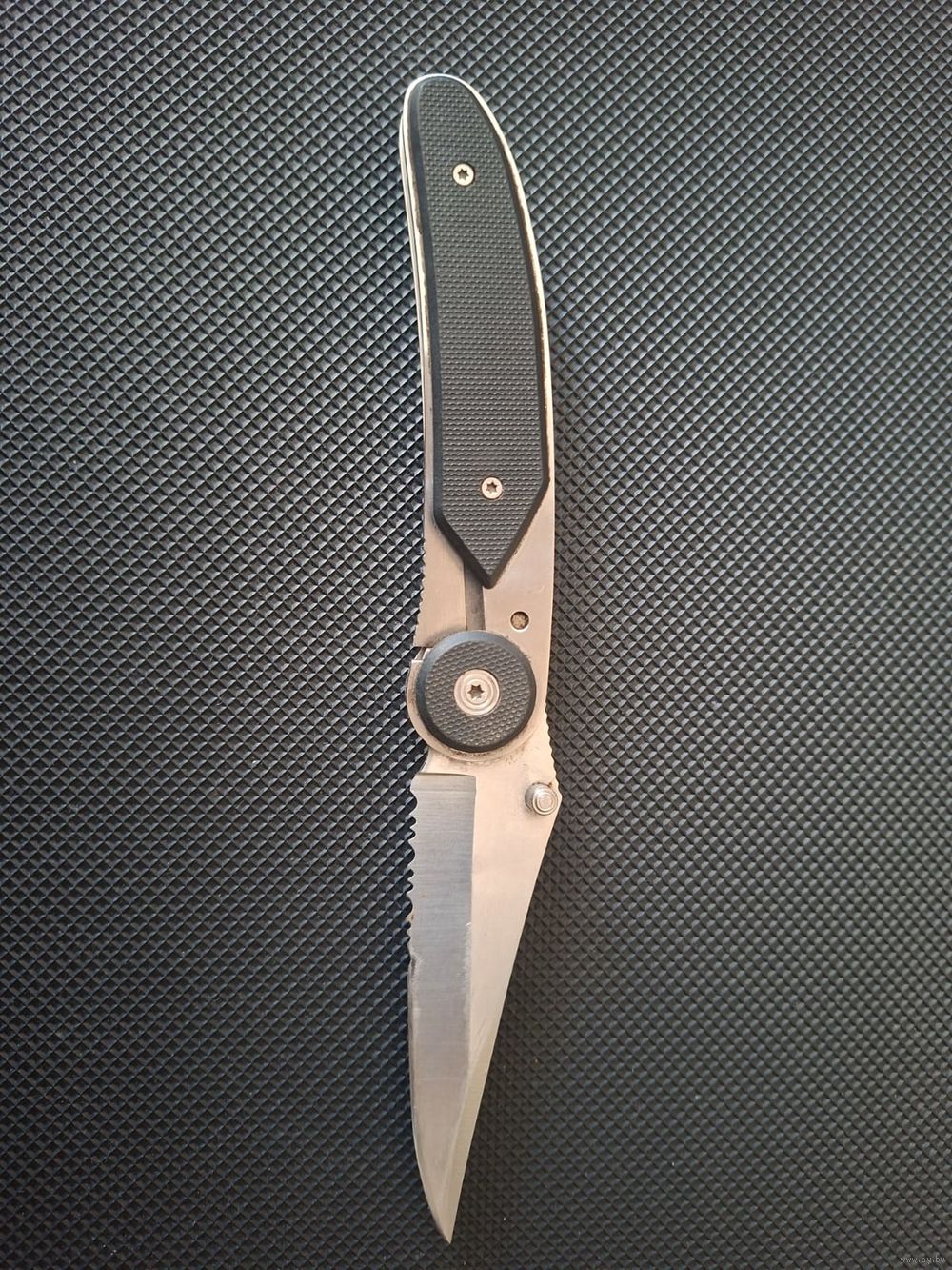 CRKT BladeLock модель Бренд из США, производство Columbia River Knife & Tool (CRK .Нож оснащен уникальной системой блокировки BladeLock, которая фиксирует клинок как в открытом, так и в закрытом состоянии. Для разблокировки нужно нажать на шпенек (пенек на лезвии). нержавеющая сталь AUS 6M; Тип клинка: Walker Clip Point (с частичной серрейторной заточкой .Механизм: Запатентованный замок BladeLock, работающий через нажатие на осевой узел/шпенек. Благодаря системе BladeLock (лезвие намертво фиксируется и в открытом, и в закрытом состоянии) нож очень надежен, что ценится туристами и охотниками. Нож выпускался в 2000-х годах..Производство этой классической версии было прекращено ориентировочно в 2005–2007 годах.