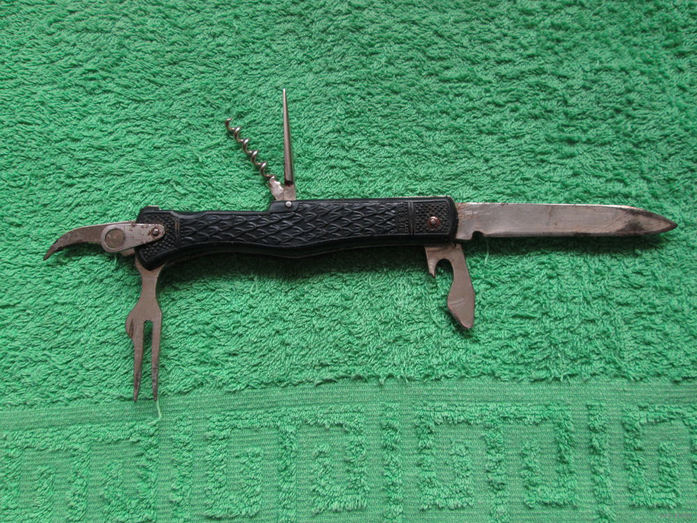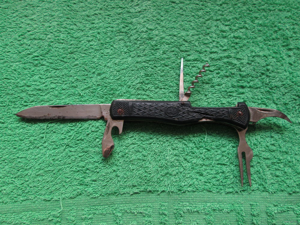 Нож 6 предметов +антапка.Все предметы отщелкиваются работают отлично .Нож походный на все случаи .Есть вилка шило нож и другое Все целое в родном состоянии,Лезвие оригинал не сточено !,Имеется легкая патина на лезвии ,от времени .Таких ножей больше ни когда не будет .