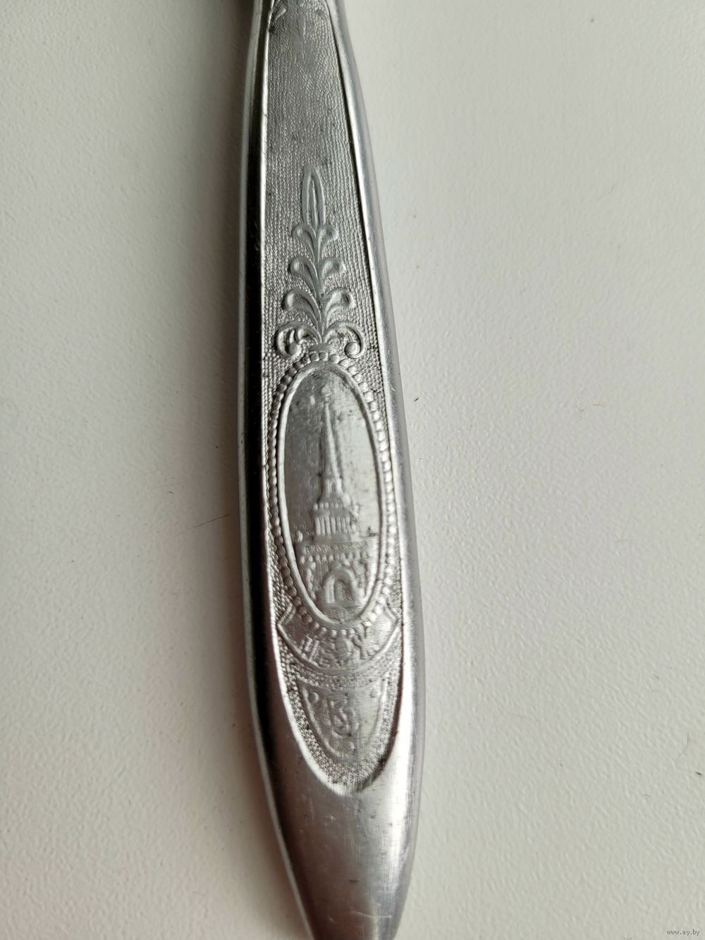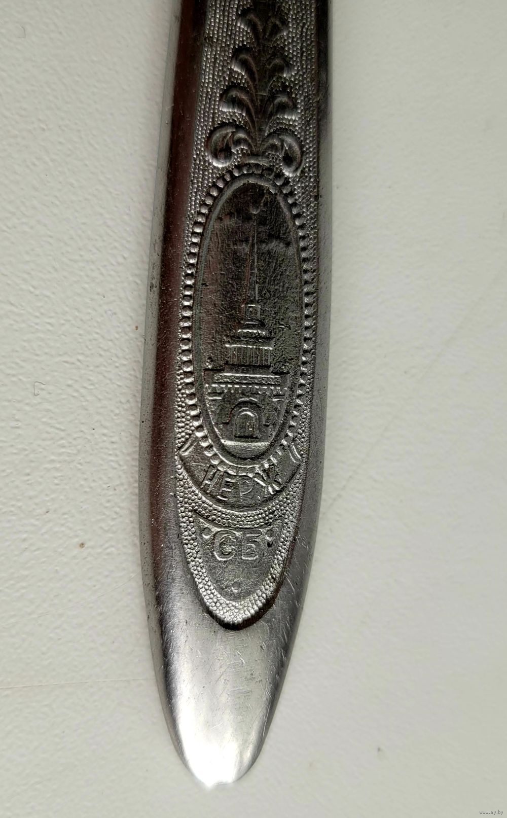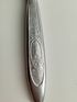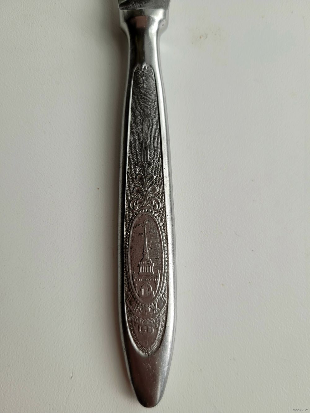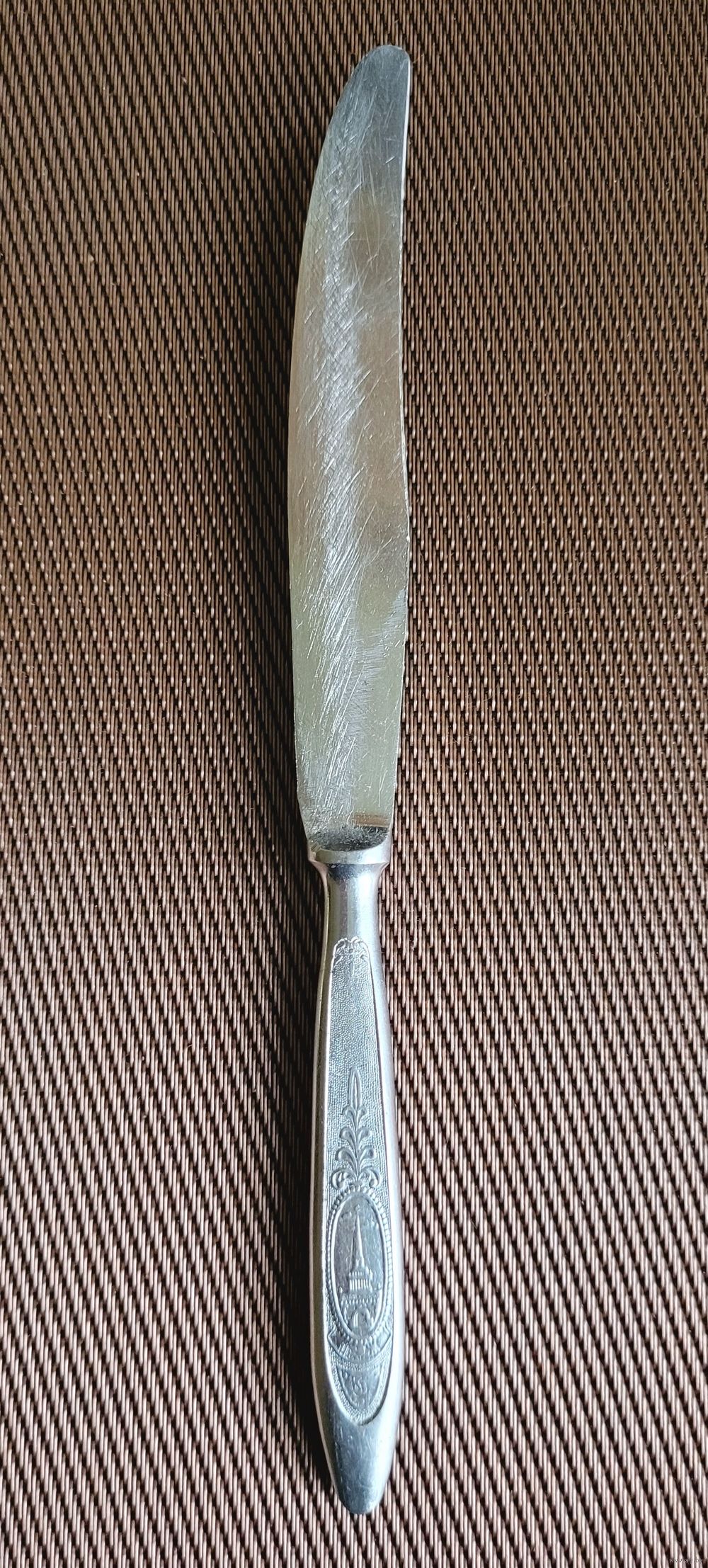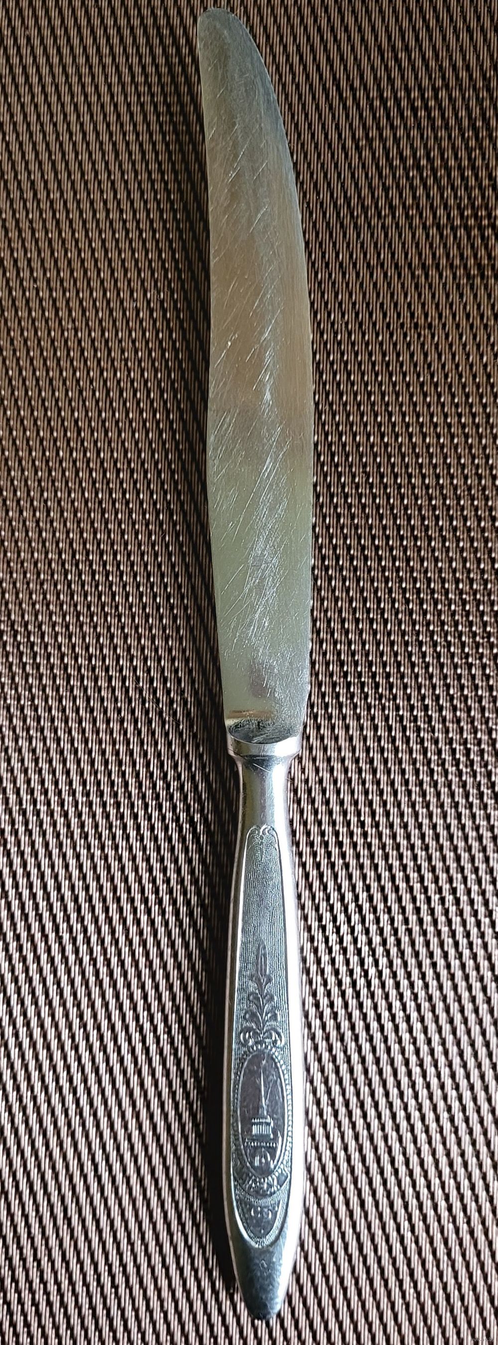 Нож столовый, нержавеющая сталь, 23 см, маркировка СБ (столовый большой). Художественное оформление ручки символикой СССР. Завод "Красная заря", Городищи, Горьковская обл., клеймо КЗ.